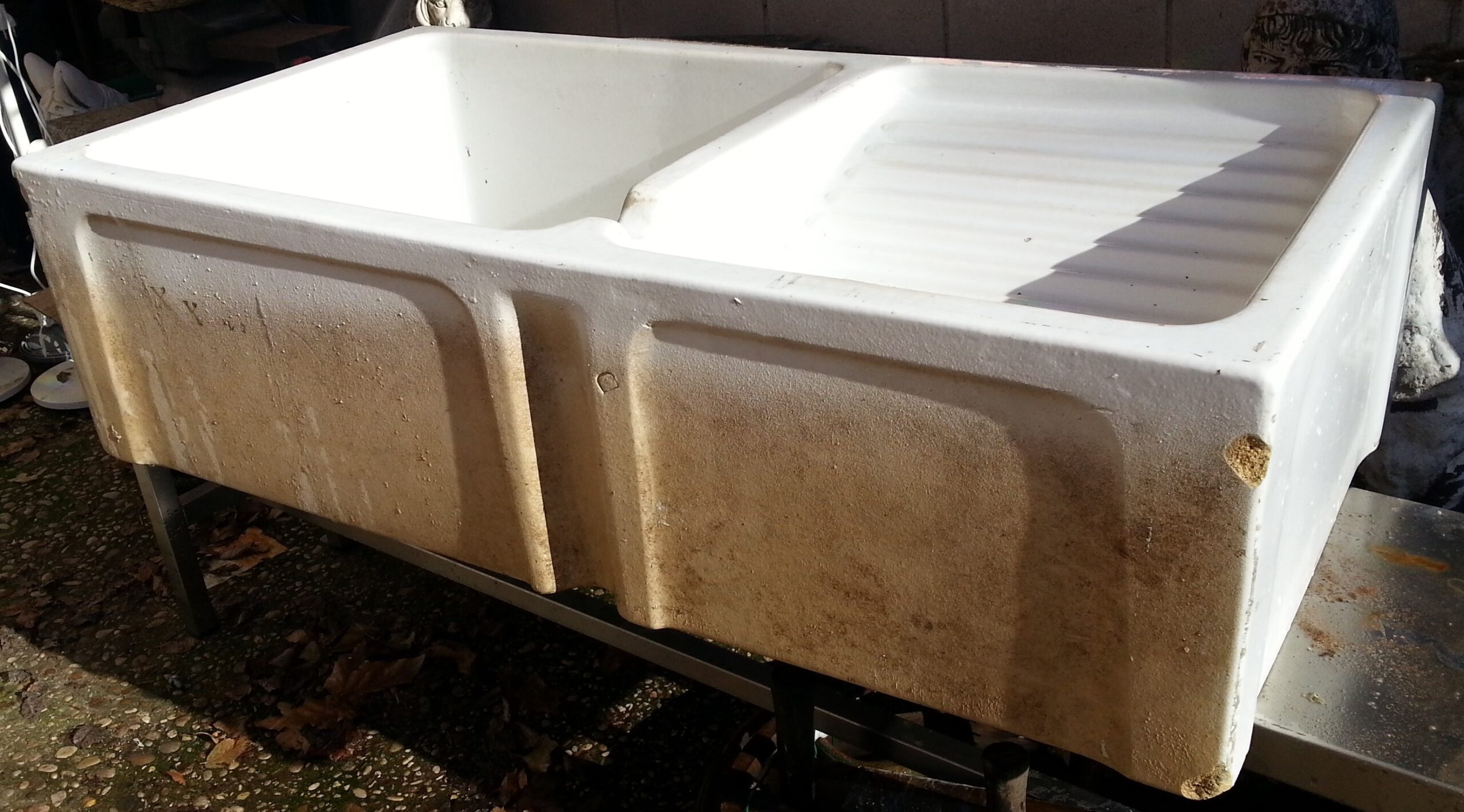 Fuerte y pesado fregadero que además tiene pila, todo en una pieza.