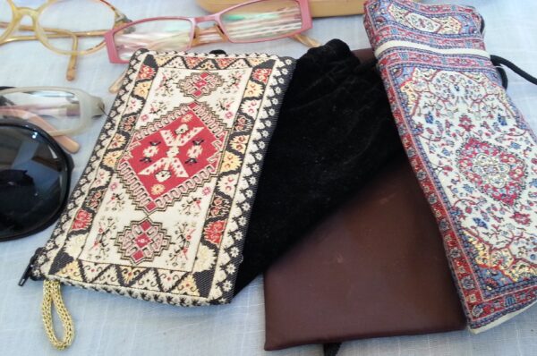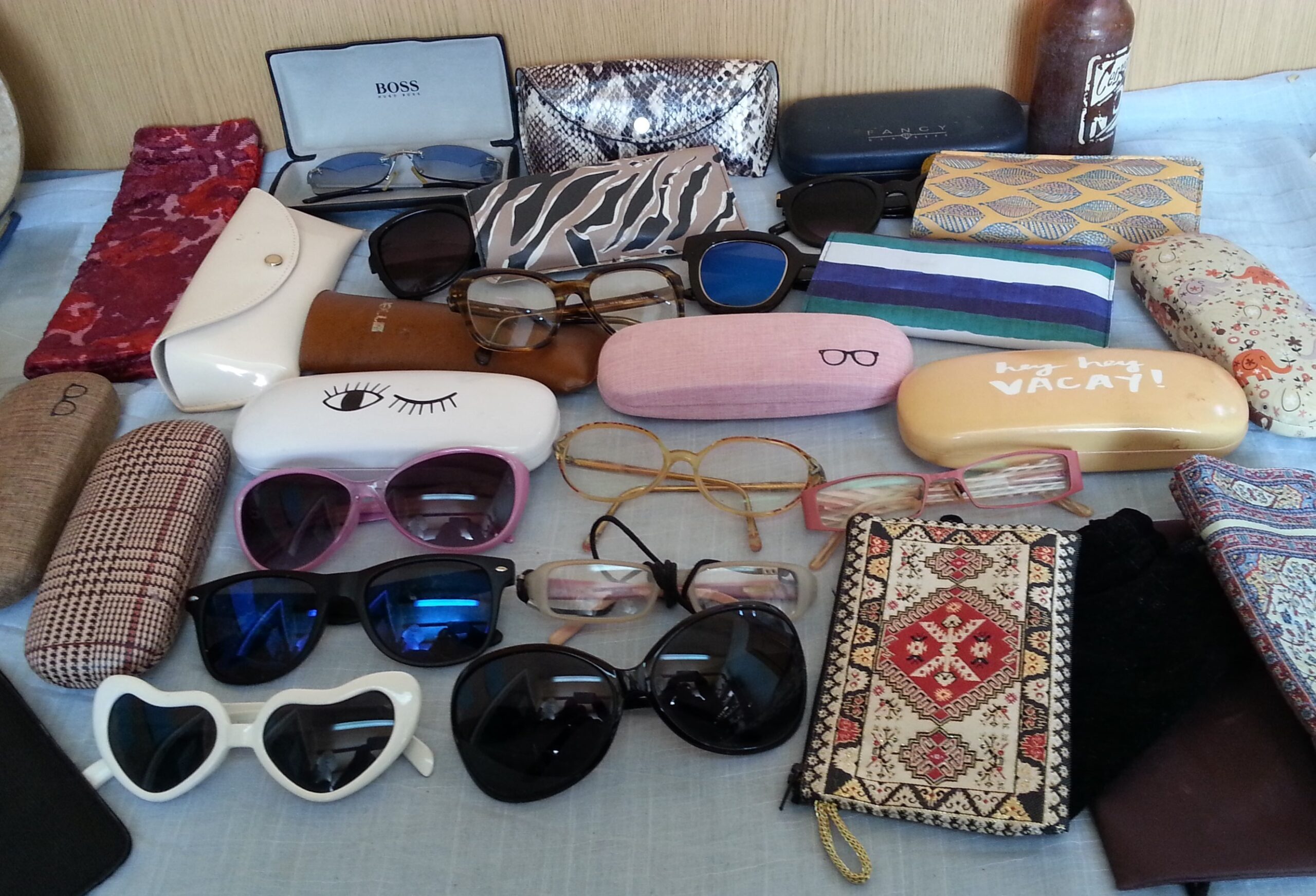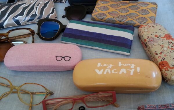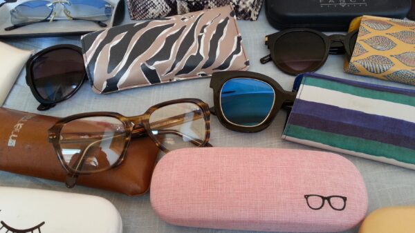 Gafas y fundas de gafas de estilo vintage en gran cantidad para venta, decoraciones y atrezzos en rodajes.