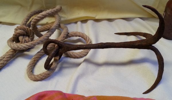 Gancho antiguo. Ancla de 3 puntas con soga incluida. Antiguo apero.