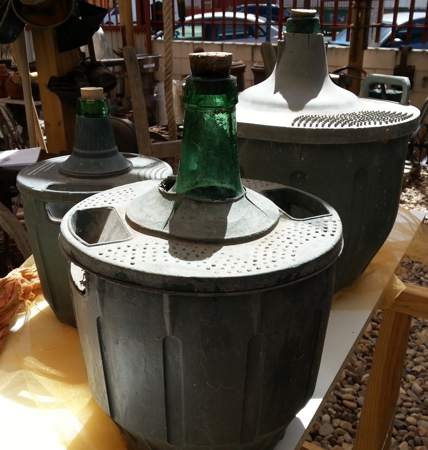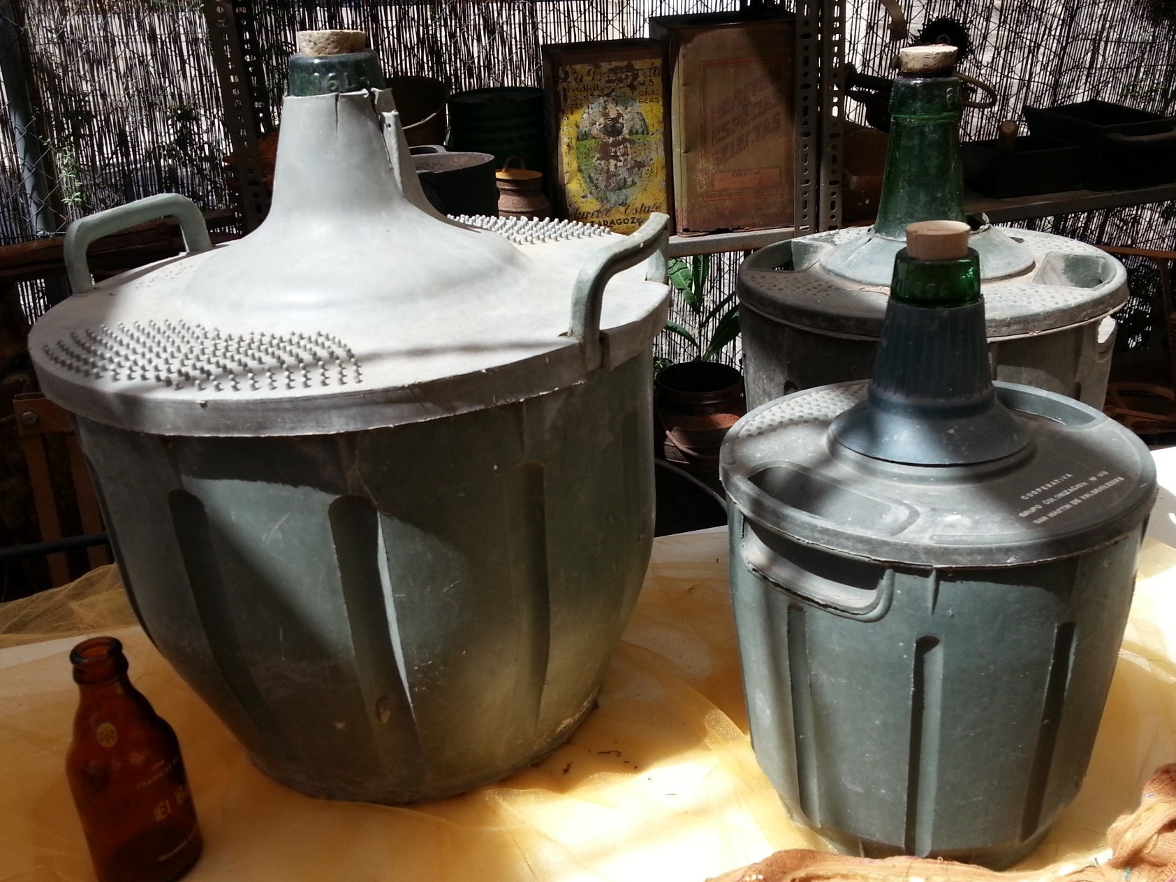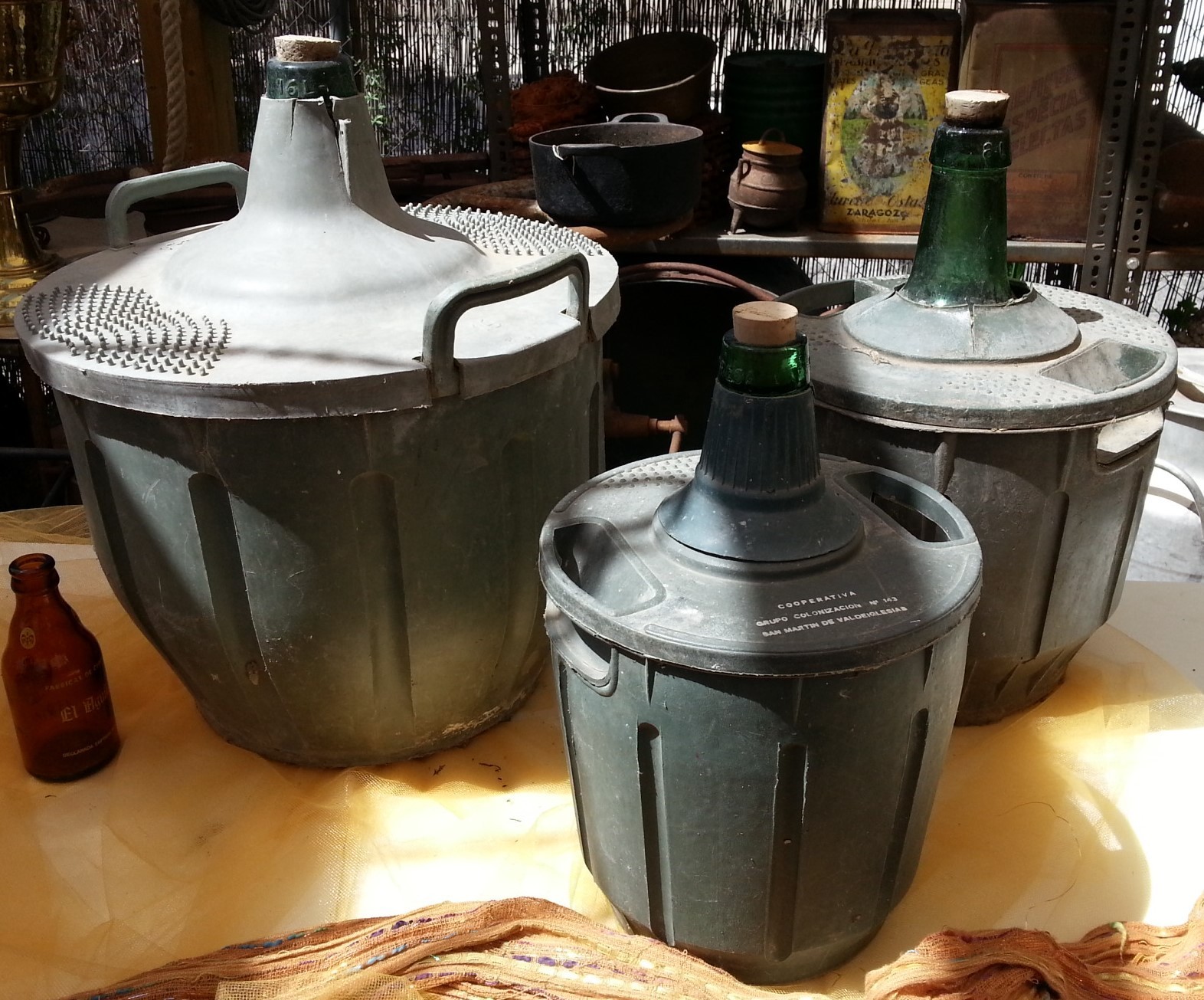 Conjunto de tres viejas garrafones de vino. Piezas de decoración todavía útiles.