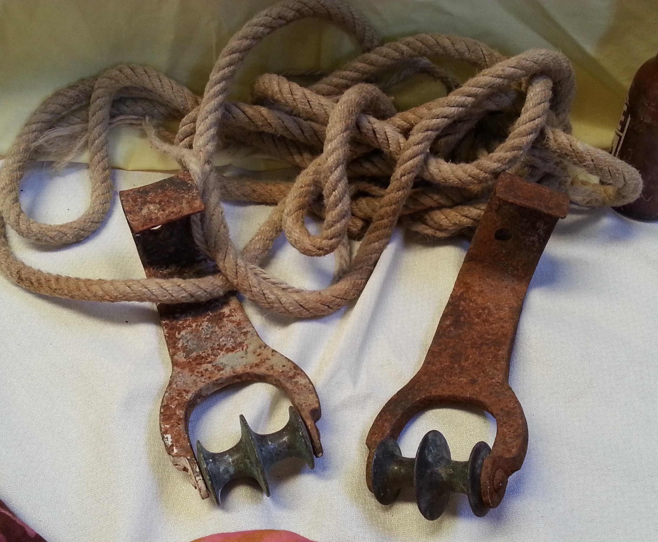 Muy rústico conjunto de roldanas y sogas viejaa. Siguen funcionando pero tiene muchos años y servirán mejor decoración rústica.
