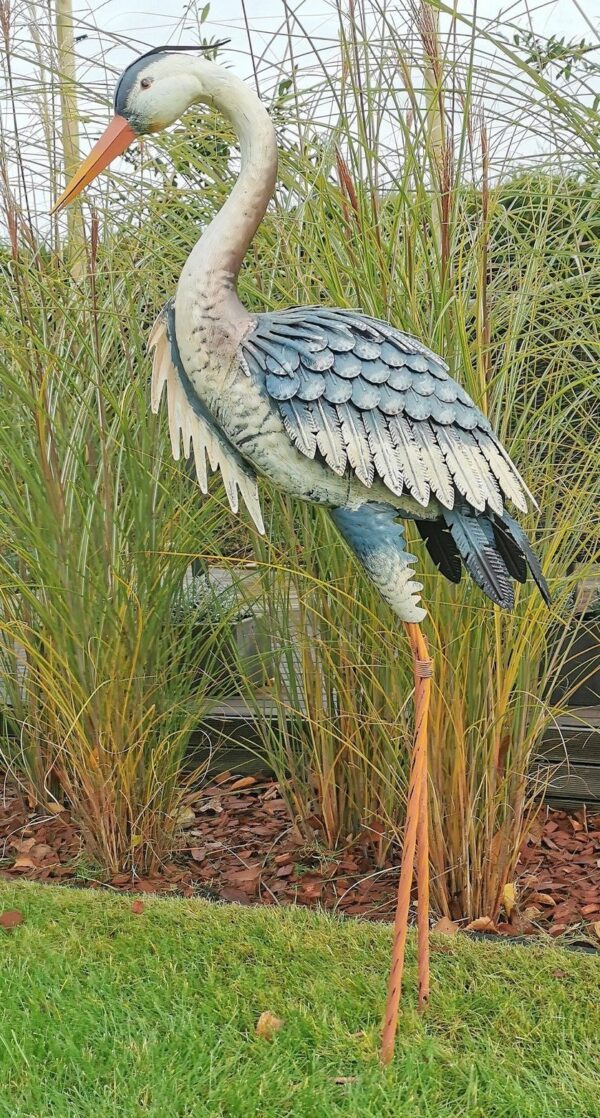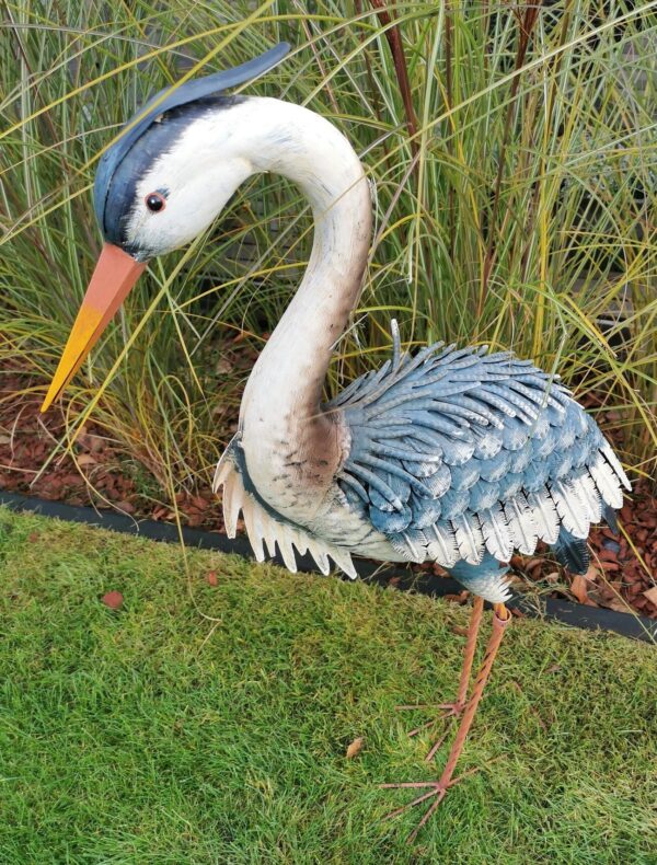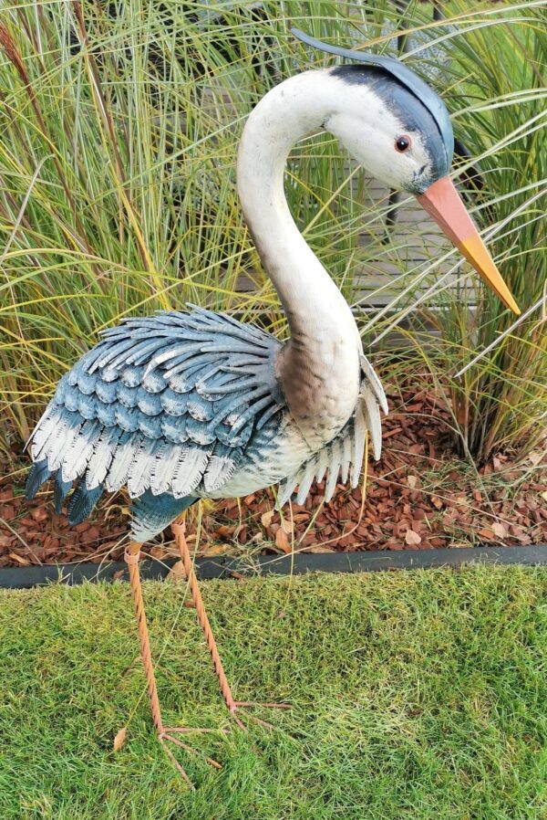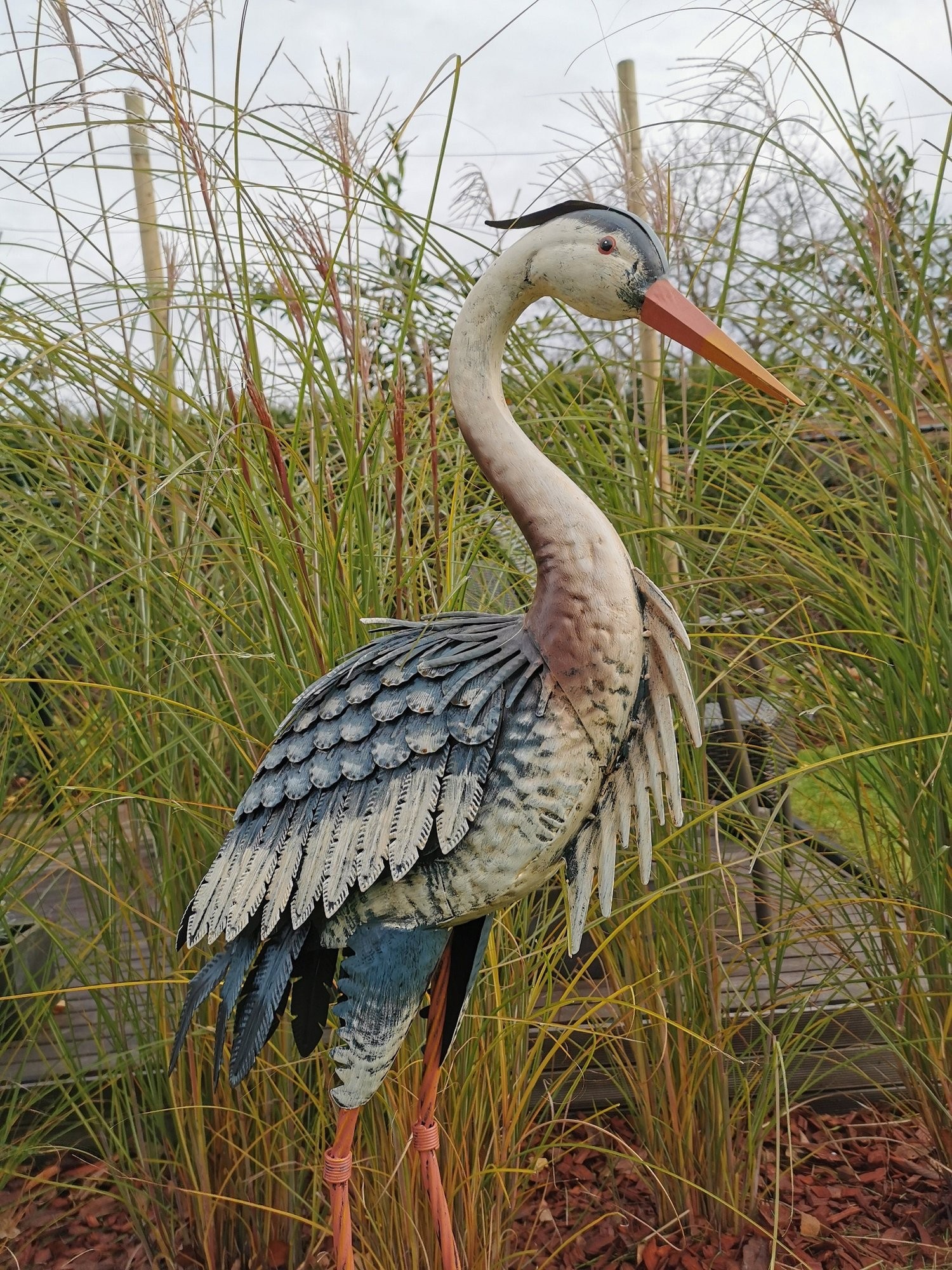 Garza. Metal policromado. Enorme. Altura 1,10 m. Escultura de jardín.