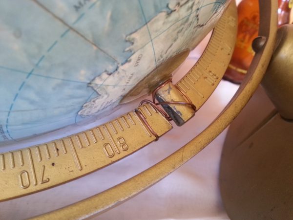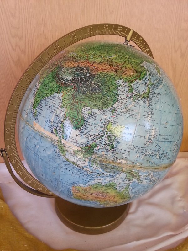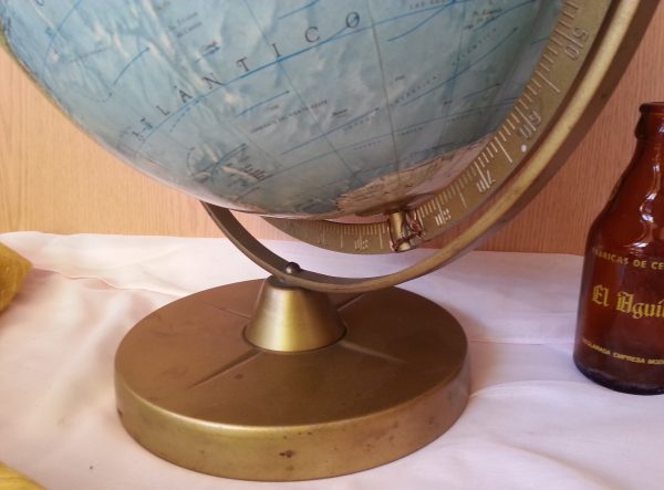 Fabricada en los años 70 este globo terráqueo será un magnífico objeto de decoración y útil todavía. Es grande y muy hermoso. Los años no han pasado en balde y algún pequeño desperfecto se observa en la bola.