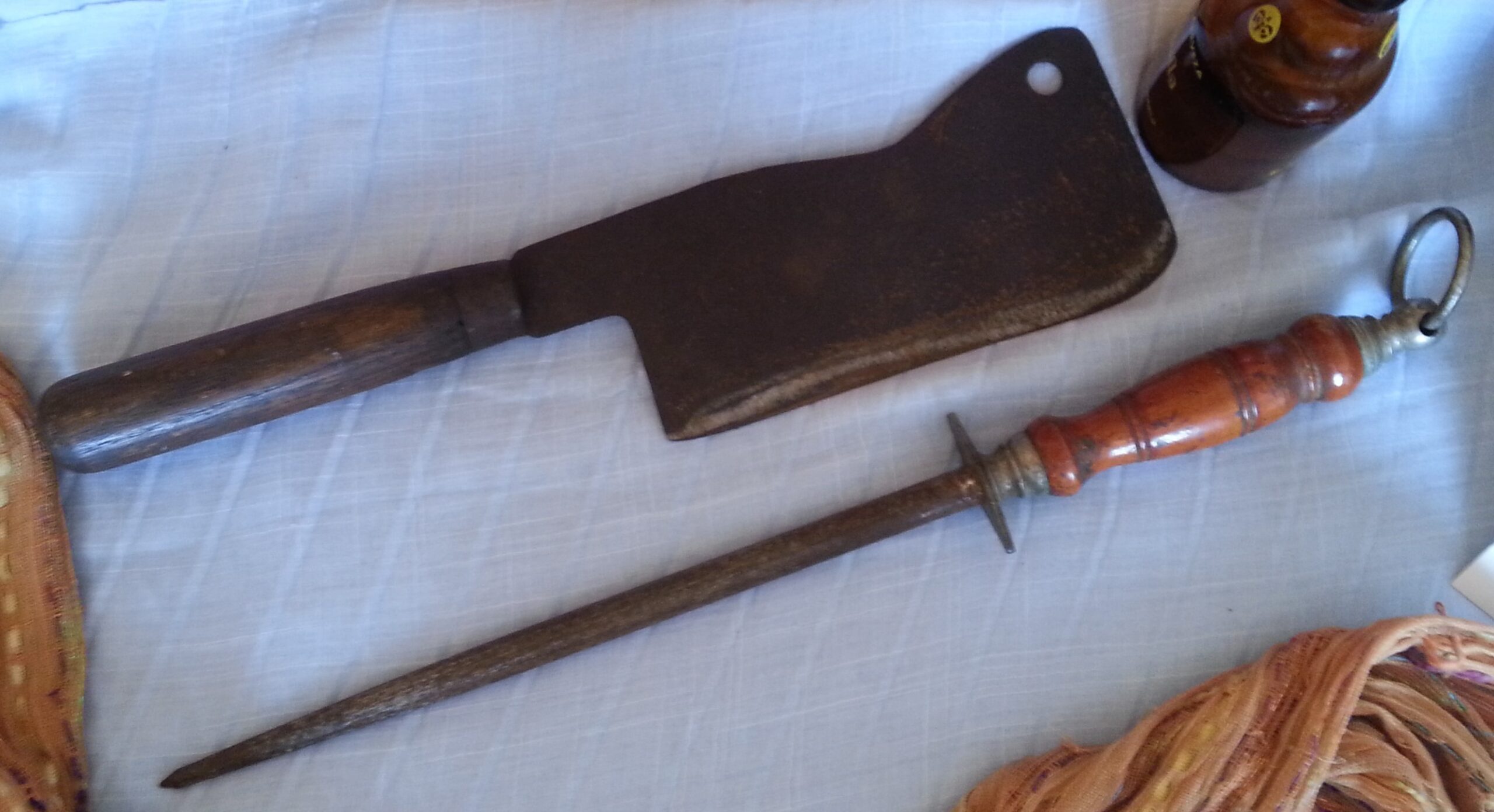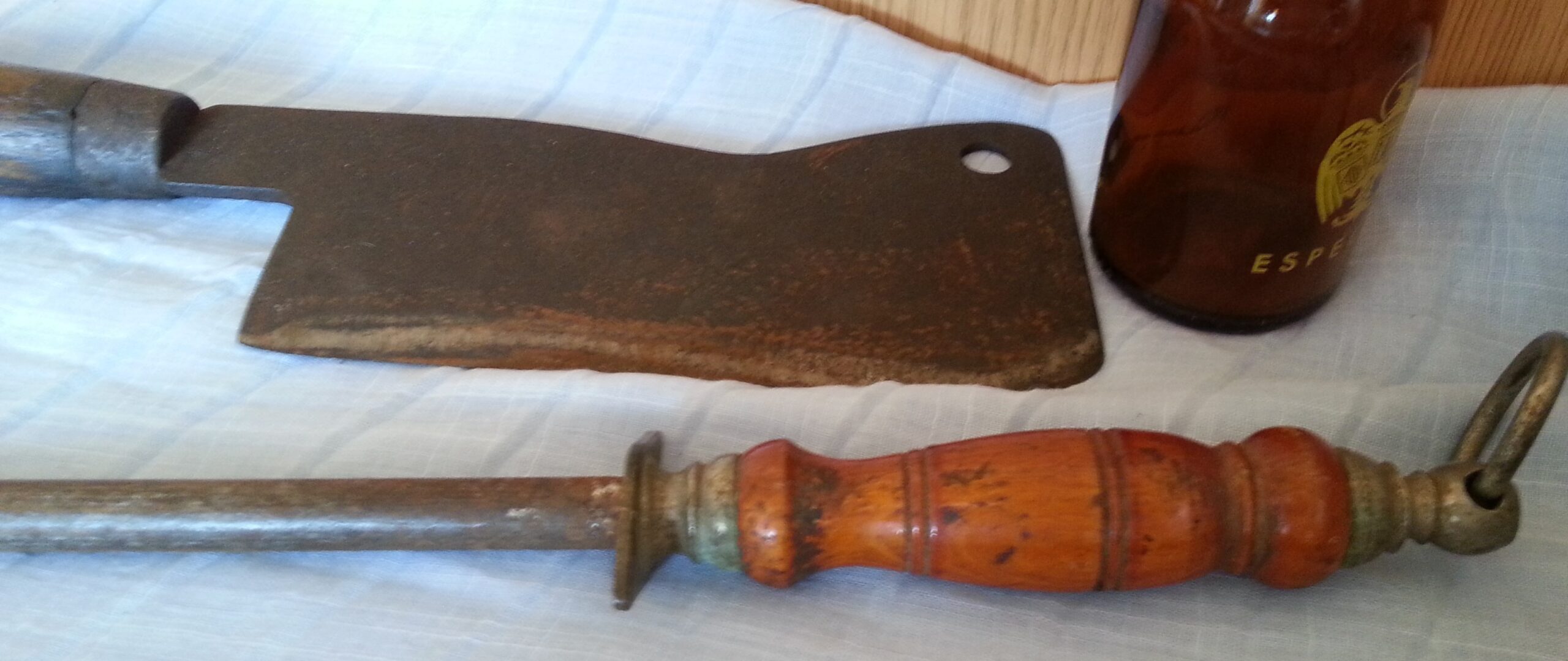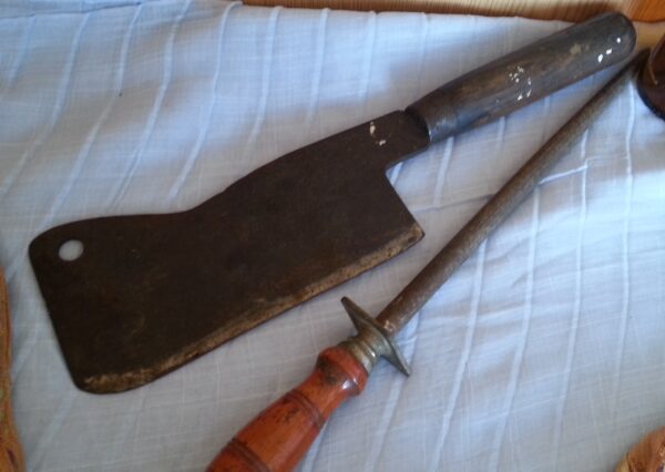 Hacha de carnicero antigua + afiladora. Conjunto emblemático.