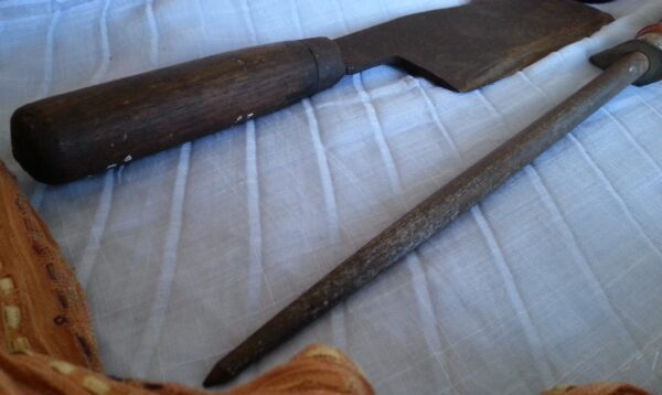 Se trata de una hacha de carnicero  antigua. Años 40-50. Fabricada totalmente en hierro. Le acompaña su herramienta afiladora impresionante con su mango de madera de la época.