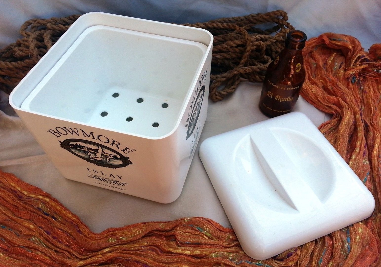 VIEJA HIELERA, CUBITERA DE WHISKY EXCOCÉS “BOWMORE” (AÑOS 70, DE COLECCIÓN): Precioso objeto de esta marca de whisky en buen estado. Fabricada en policarbonato mide 20 cm de altura * 19 cm de lado. Ref. Biblio. nº 17