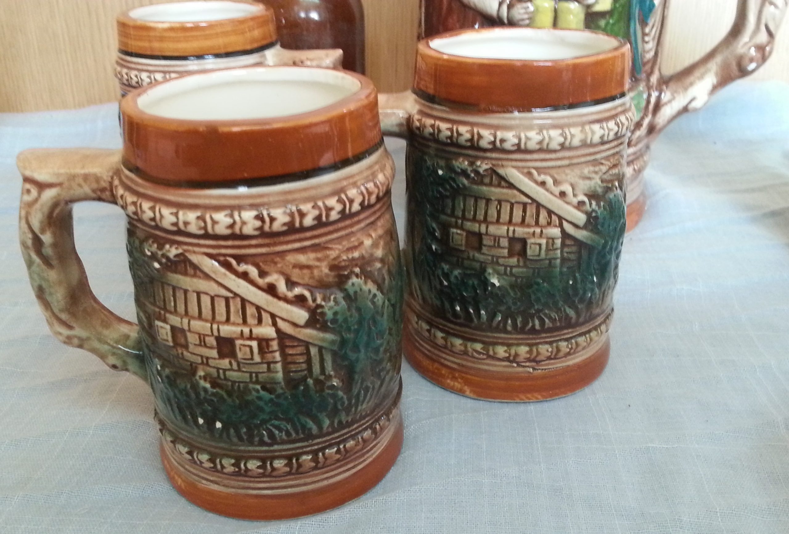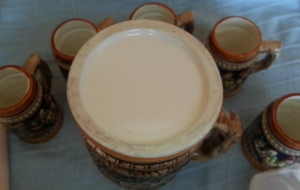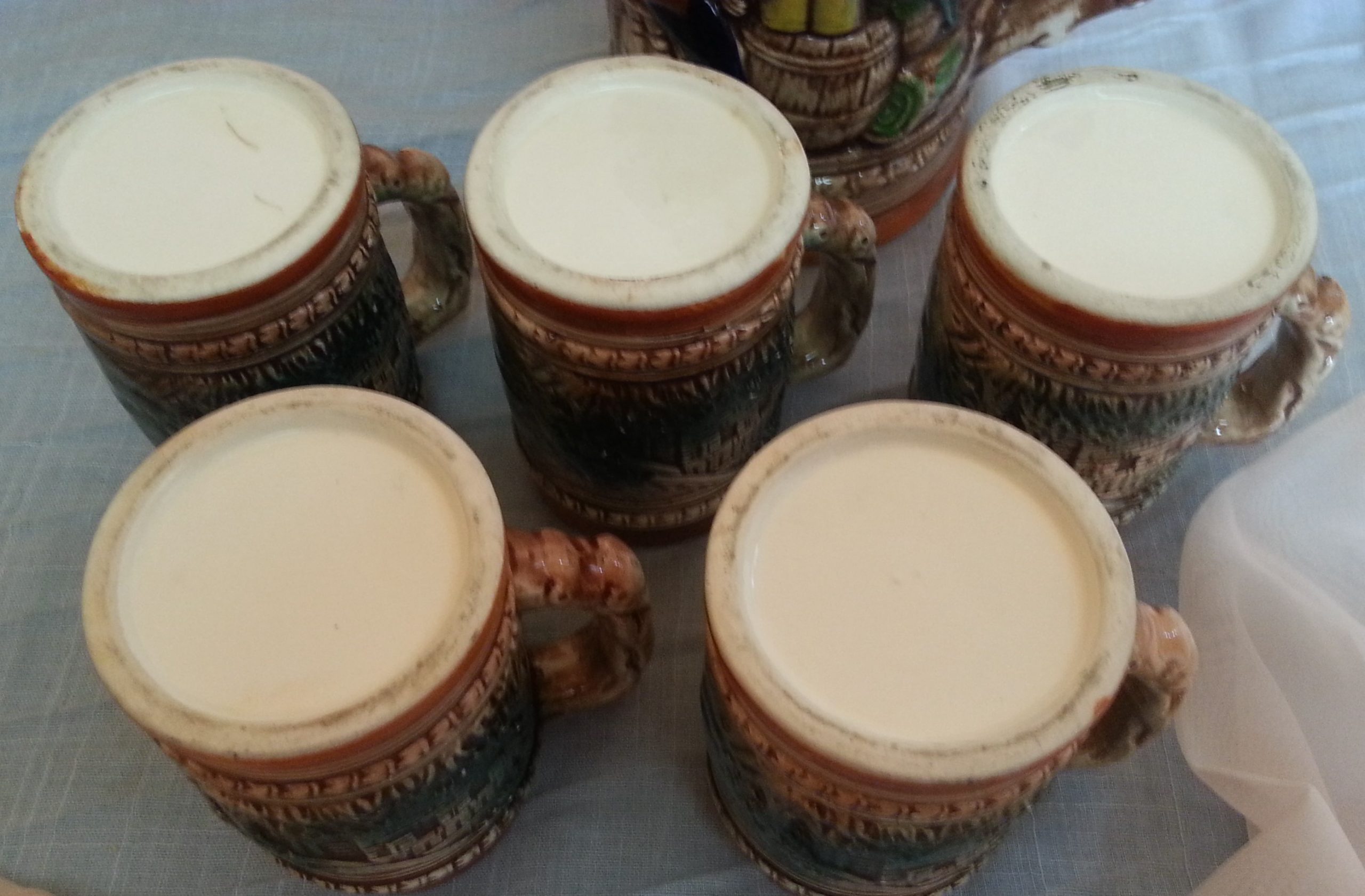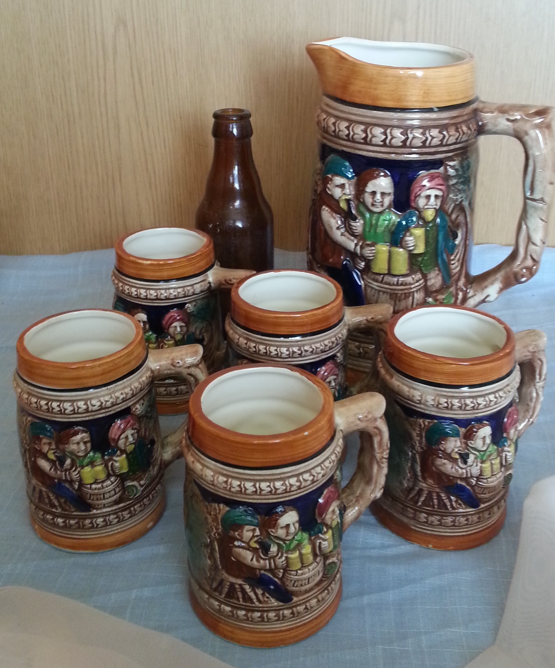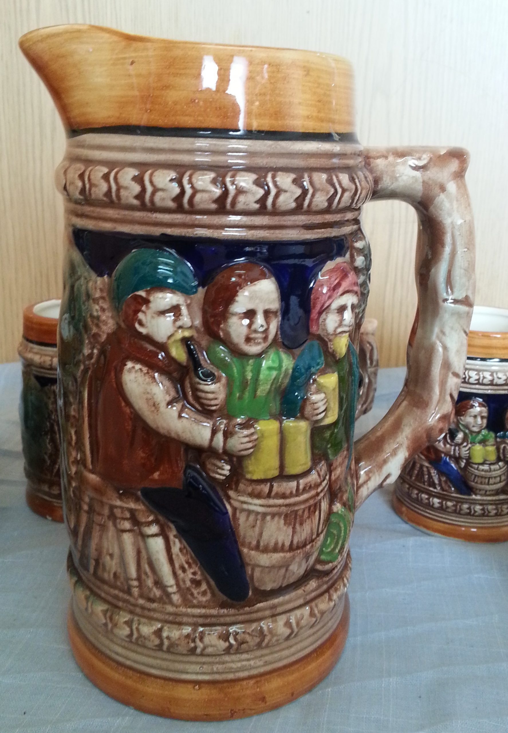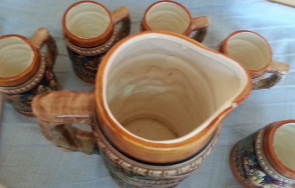 Precioso juego completo de Jarras esmaltadas muy decoradas para cerveza, agua.