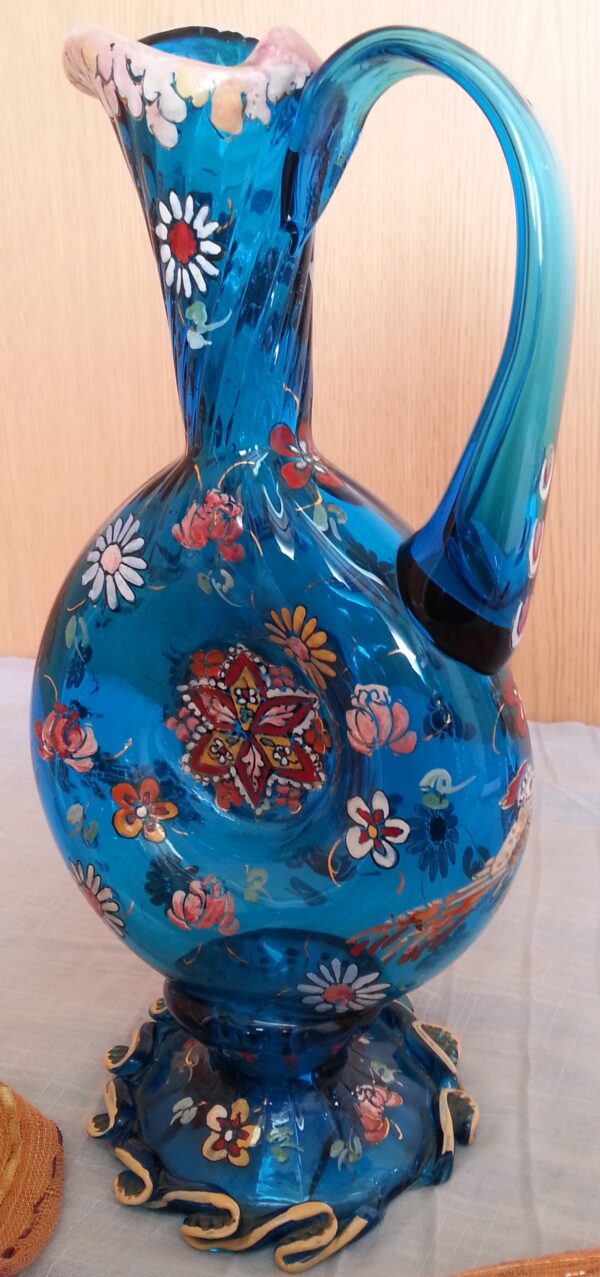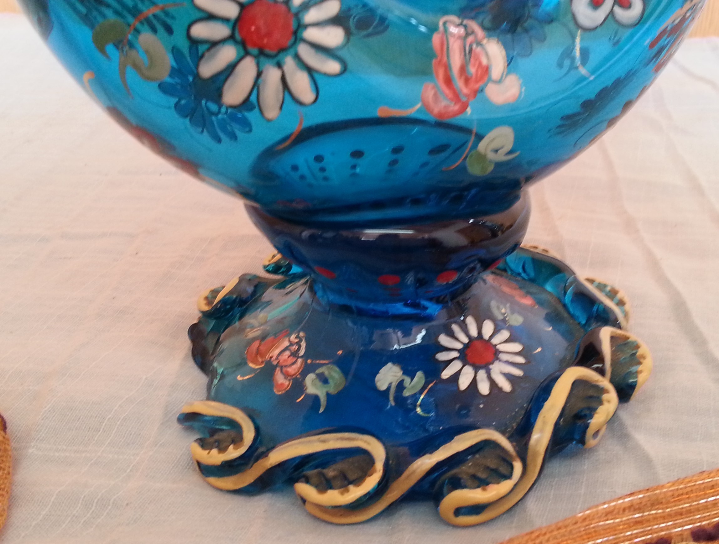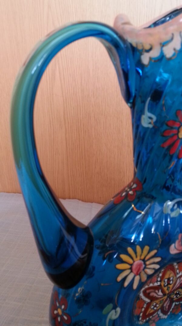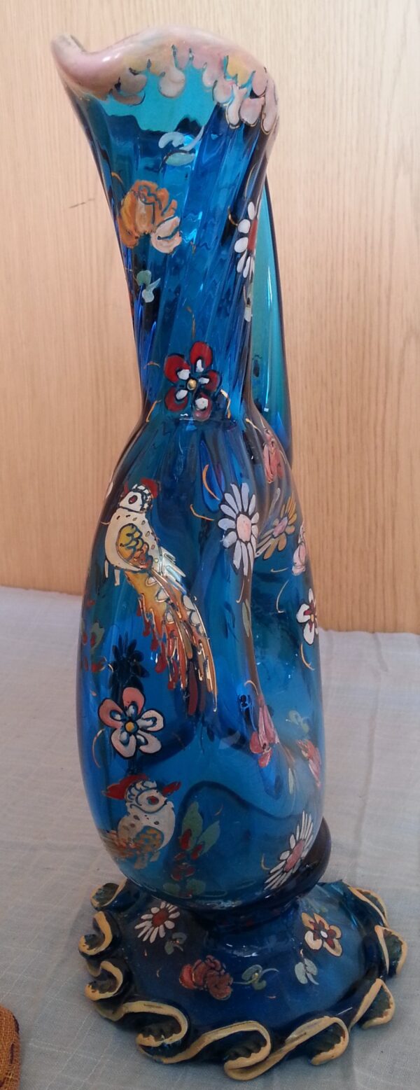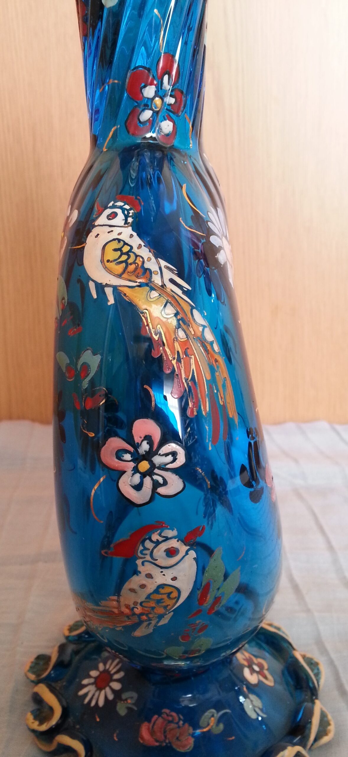 Jarrón en vidrio azul con motivos florales. Muy buen estado.