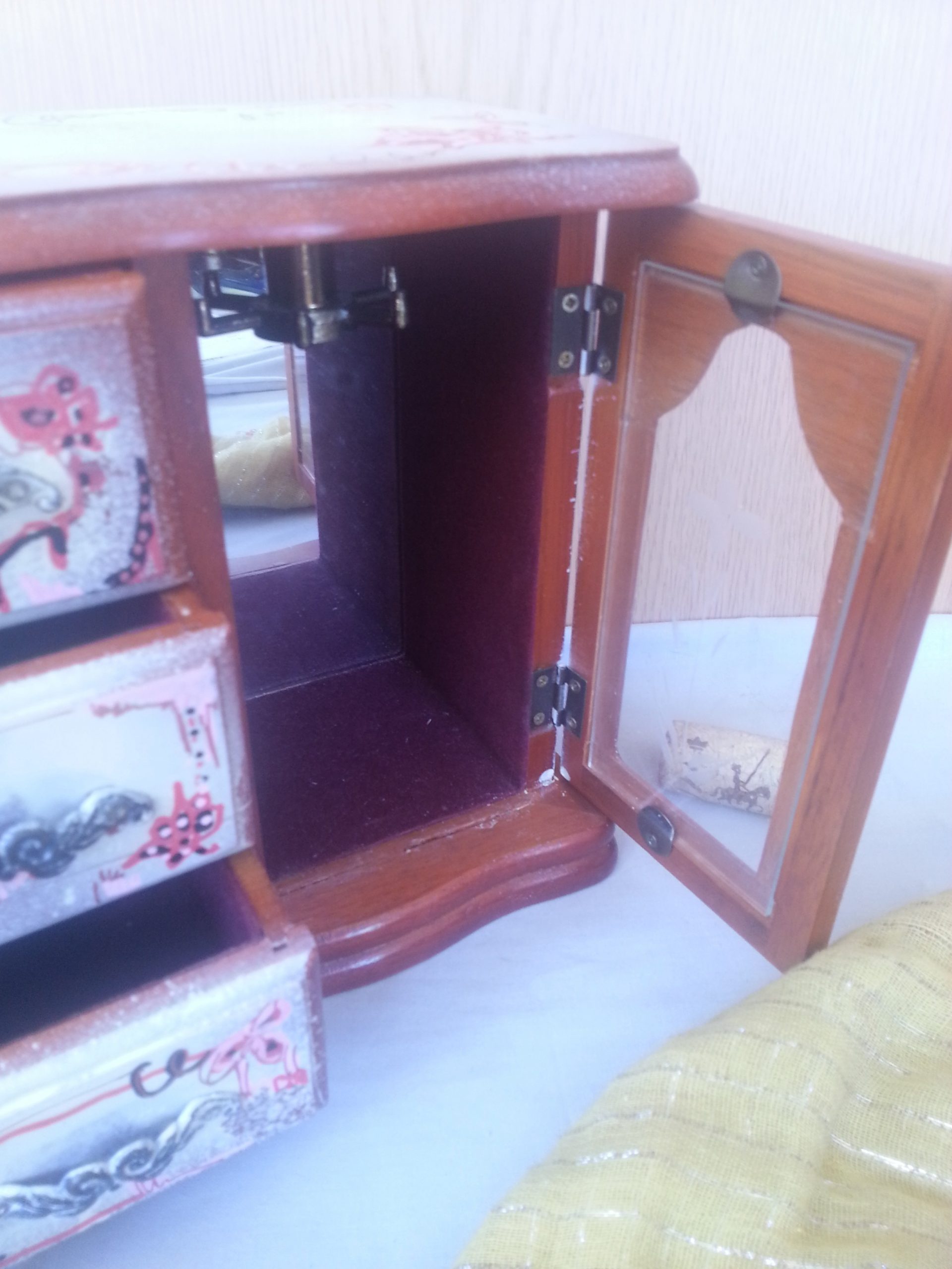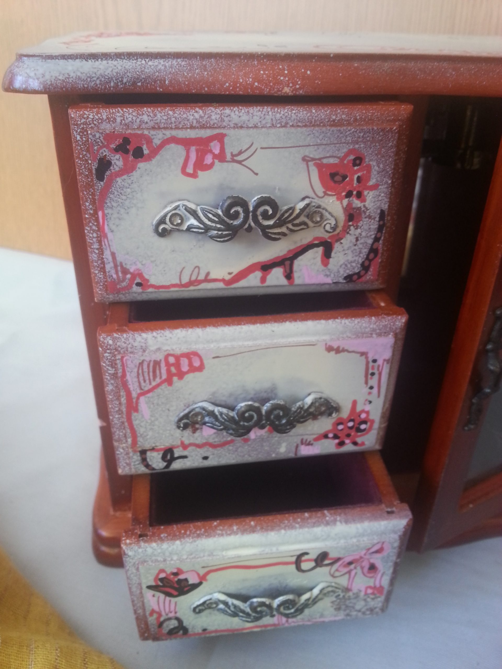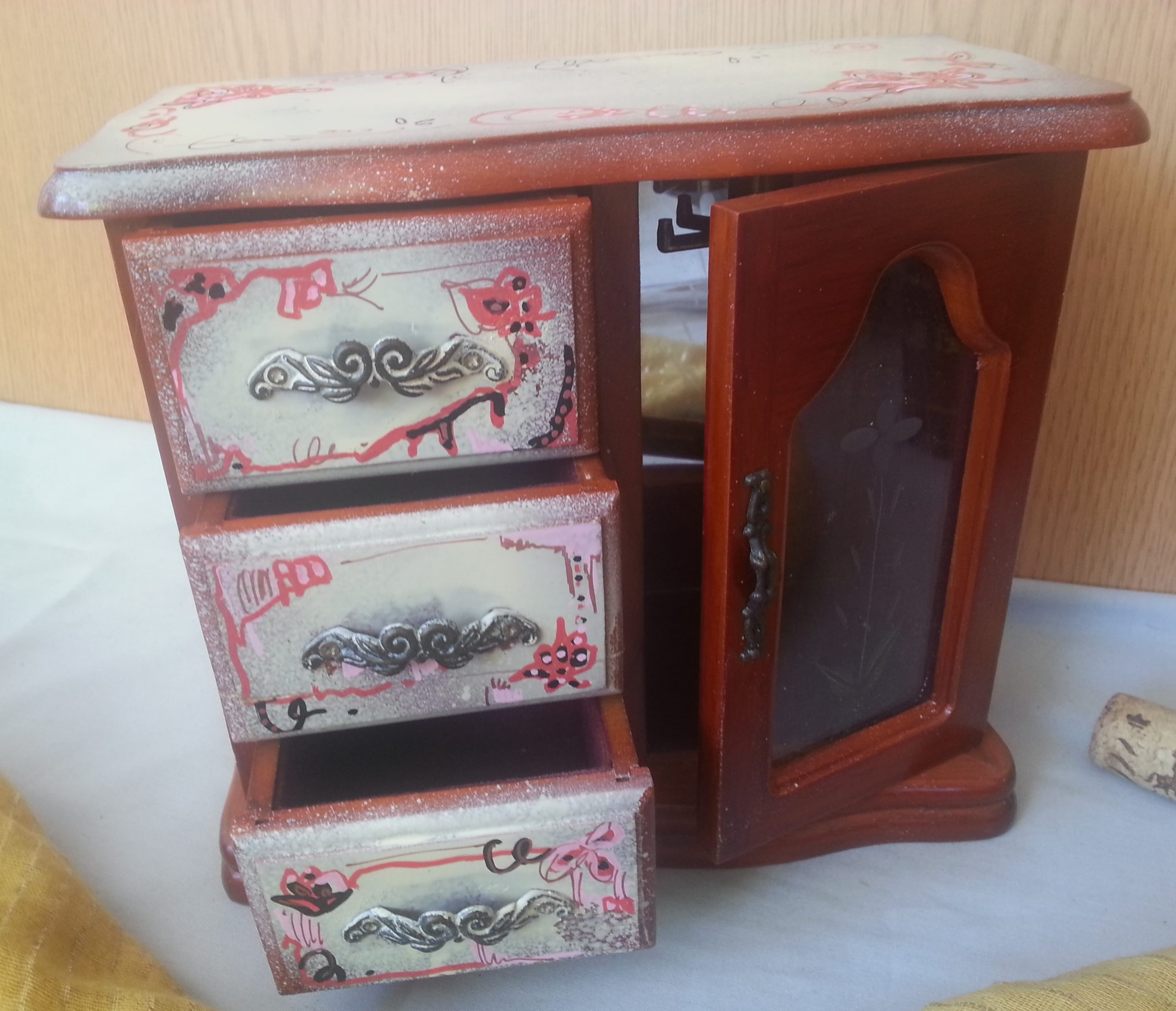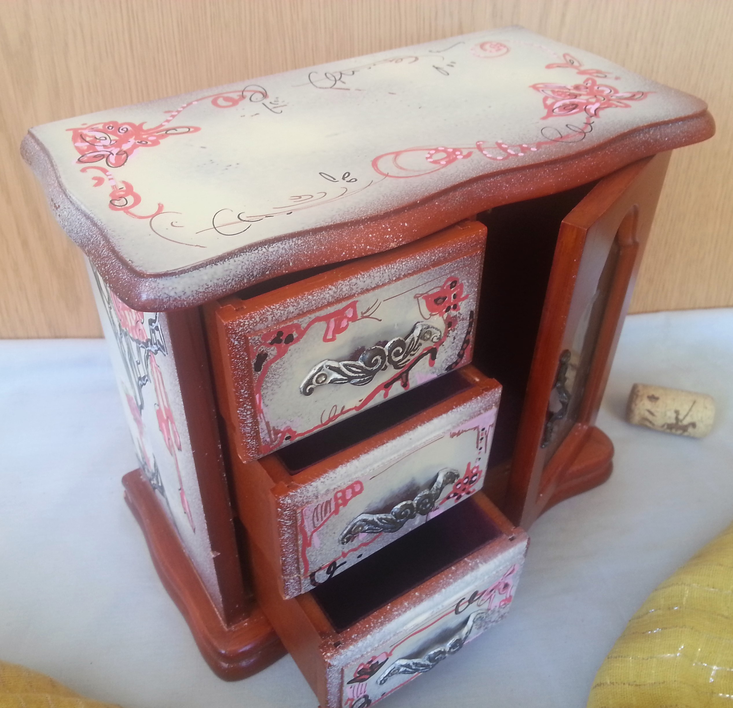 Tres cajones, un armarito con cristal. También tiene el mecanismo para ser una caja de música cuando se abre el último cajoncito.