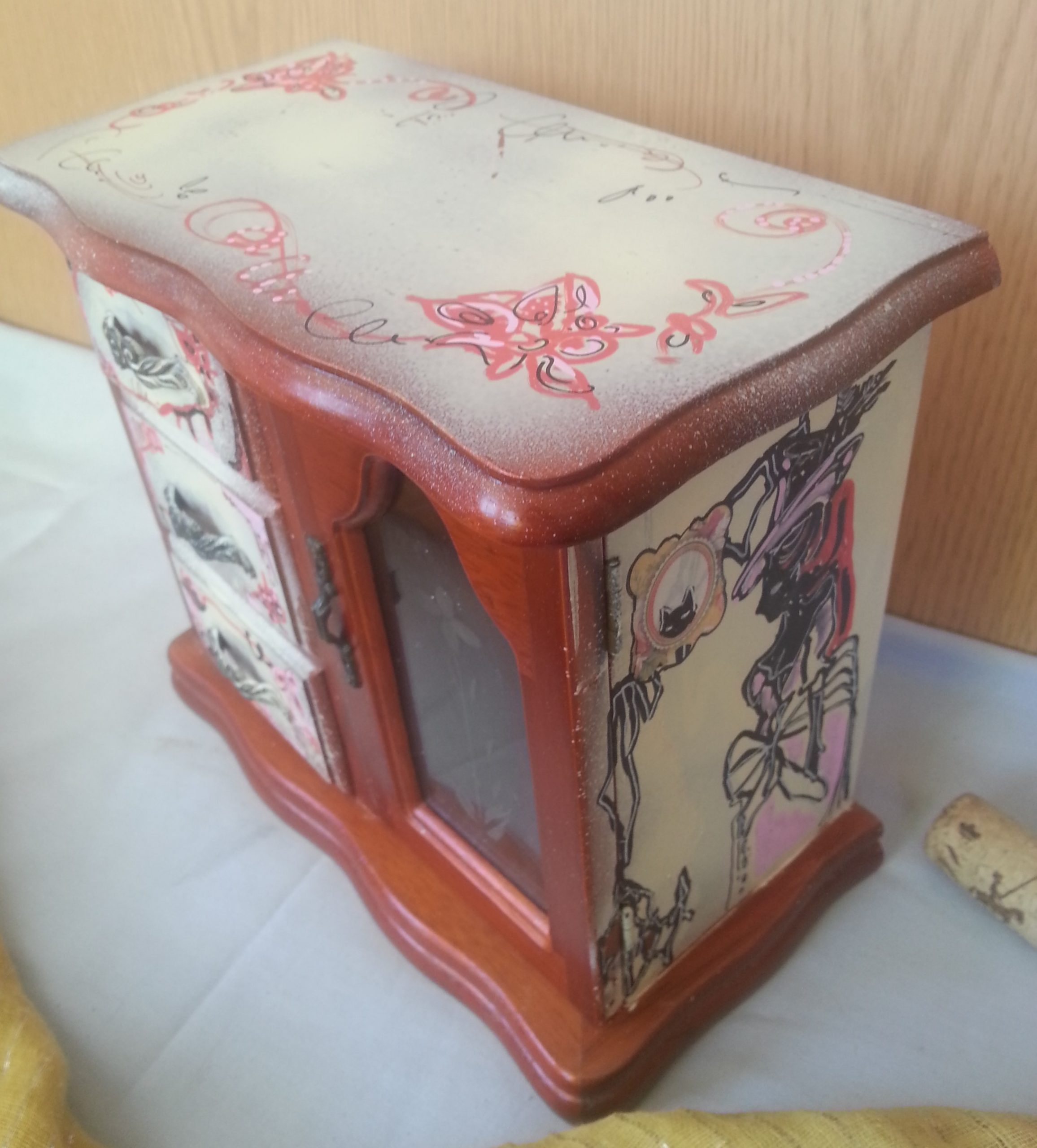 Fuerte y pesado este armario joyero construido en madera y re-decorado a mano. Es único y original.