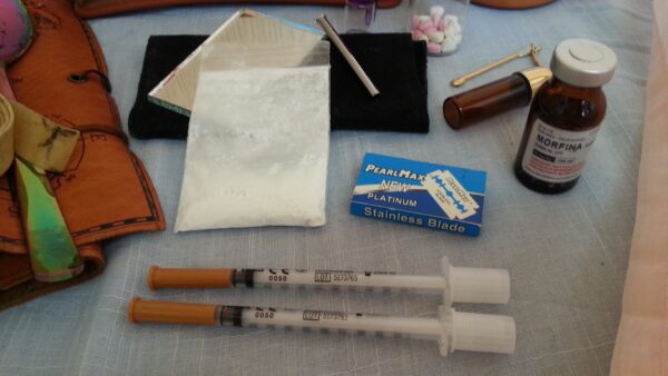 Kit de drogadicción para recreación de escenas en espectáculos. Formado por: Jeringuillas, estuche cocaína, estuche heroína, hachís, algodón, etc….