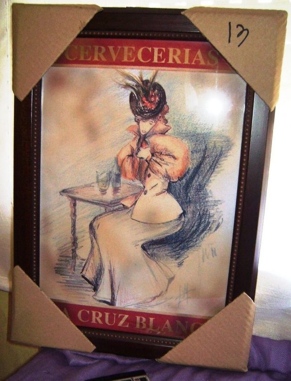 LÁMINA DEL MUNDO DE LA CERVEZA (CERVECERÍAS CRUZ BLANCA): PRECIOSOCUADROTOTALMENTE NUEVO (SIN DESPRECINTAR) PREPARADO EN MADERA ENVEJECIDA Y CRISTAL. ESTA SERIE DE CUADROS SÓLO SE ENCUENTRAN EN LAS FRANQUICIAS DE ESTA CADENA DE CERVECERÍAS. EN ESTA SERIE DE MODELOS, SE REPRESENTAN DIFERENTES MUJERES VESTIDAS DE TRAJES REGIONALES DE LAS CERVECERÍAS LA CRUZ BLANCA. EL TAMAÑODE ESTOS CUADROS ES DE47 CM. DEALTO *34 CM. DE ANCHO, CON UN GRUESO DE MARCO DE MADERA DE 3 CM. Incluyen el soporte de sujección atornillado al marco para que sólo tenga que sujetarlo a su pared. Los cartones que se ven en las esquinas son las cantoneras protectoras para que no se estropeen las esquinas con algún golpe mientras los tengo almacenados. Están enmarcados por un verdadero profesional a la perfección, e imitan sus molduras a la madera vieja con estilo, gusto y buen saber hacer. Protege la lámina un cristal que remata la enmarcación perfectamente ajustado. Ref. Cuadros nº 528