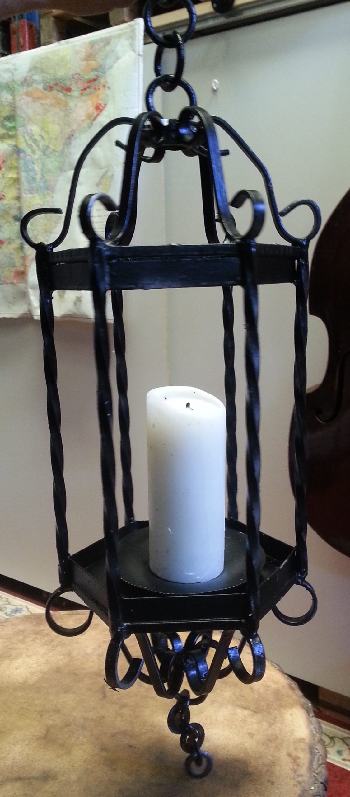 Fuerte y pesada esta lámpara de techo de estilo medieval se encuentra en muy buen estado general.