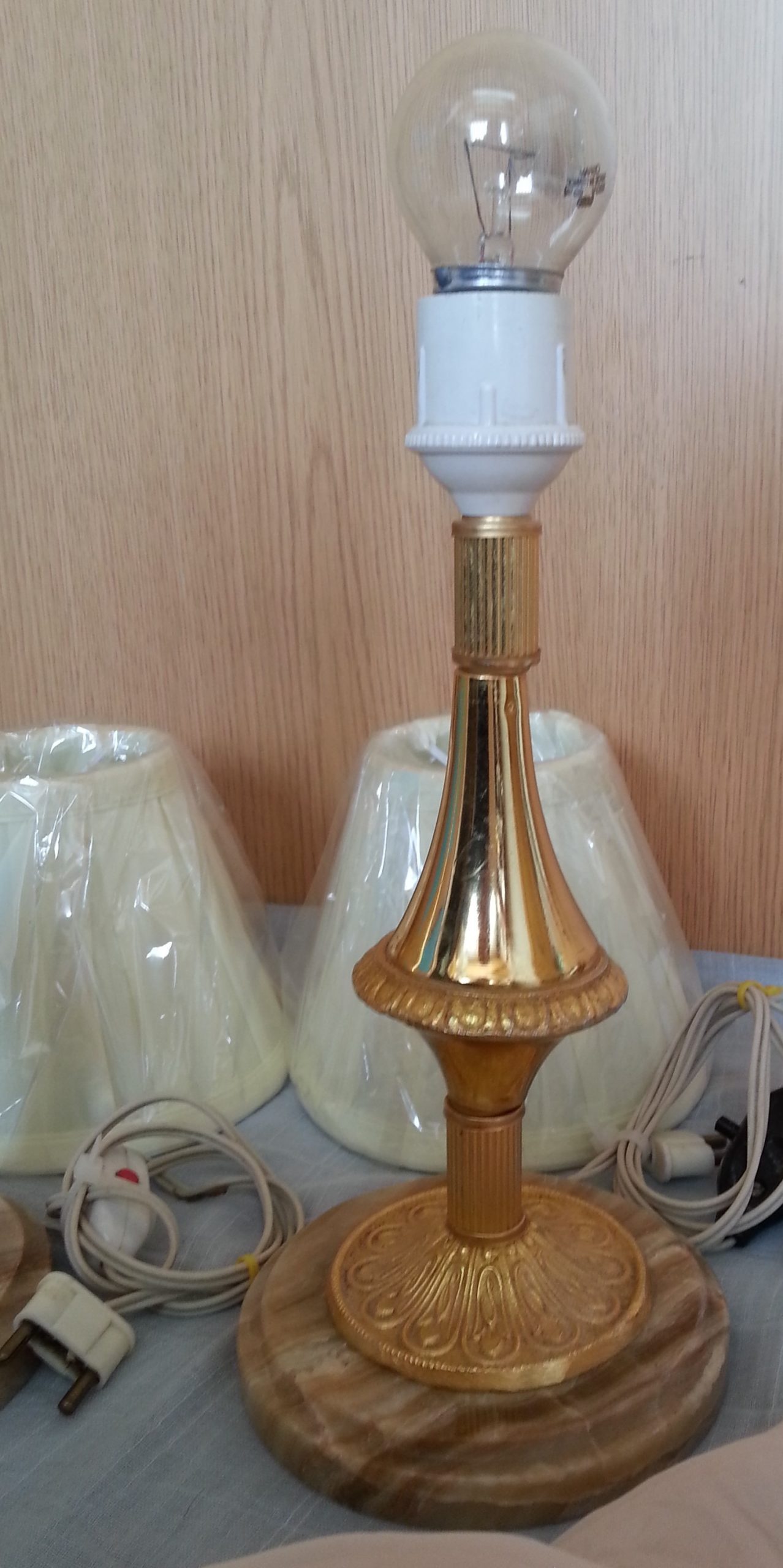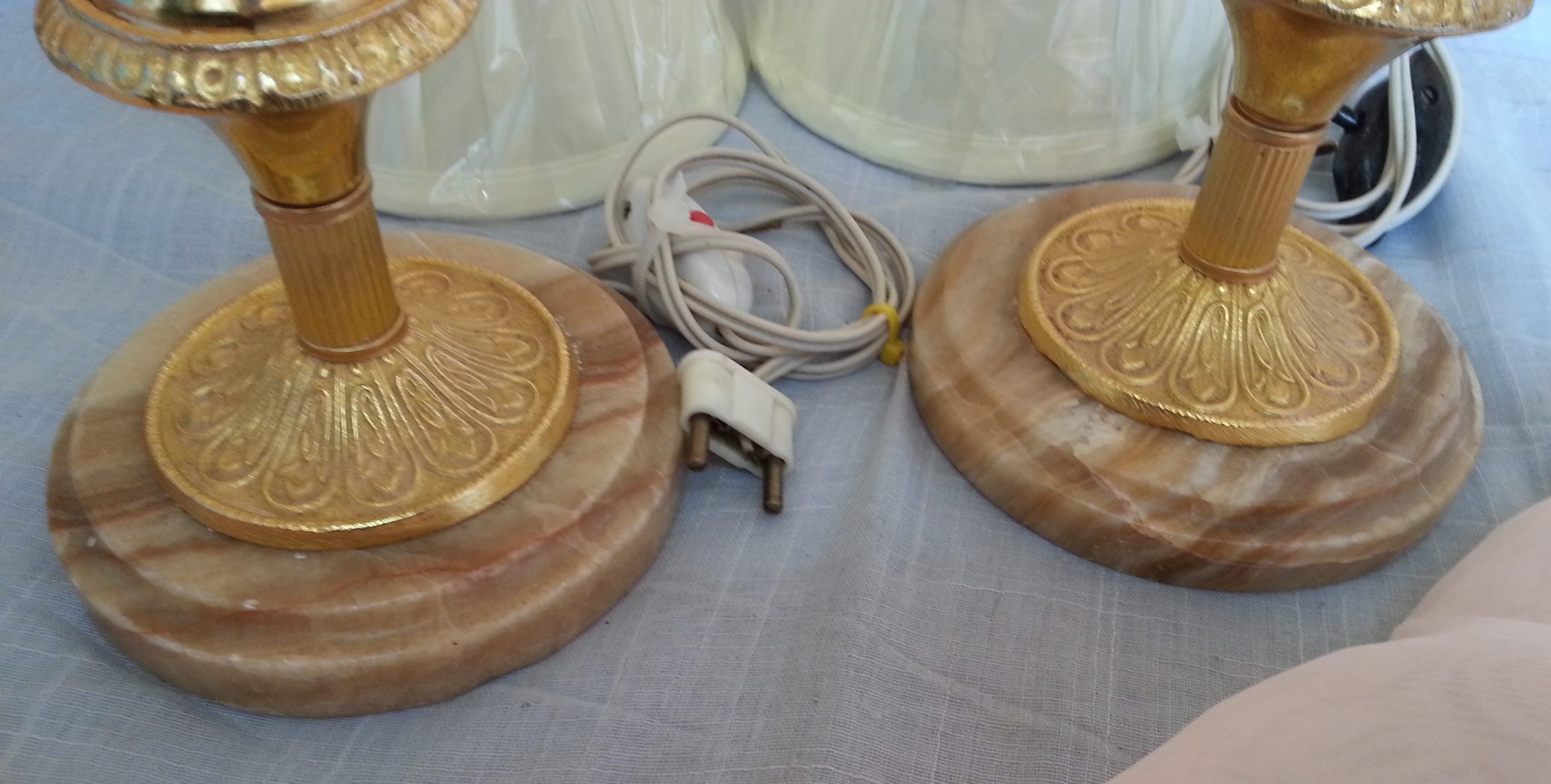 Preciosa pareja de lamparillas de mesilla con base de mármol y mástil en latón. Las pantallas son nuevas, a estrenar. Funcionan perfectamente.