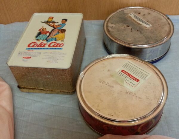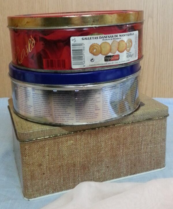 Conjunto de tres latas de galletas vacías para reutilizar en decoración de escaparates, etc…