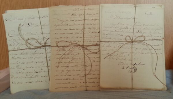 Hemos preparado diferentes conjuntos de documentos manuscritos o cartas y legajos en atillos. Dispuestos para atrezzar y decorar sus escribanías o escaparates.