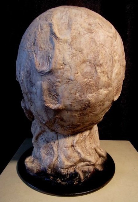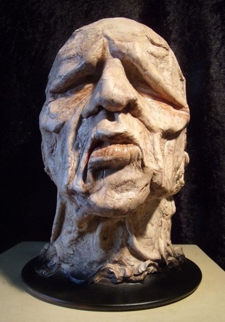 Cabeza de ser humano infectado con la enfermedad de la lepra. Réplica de las terribles secuelas que esa enfermedad causaba en el s. XIII europeo. Realizada completamente a mano.
