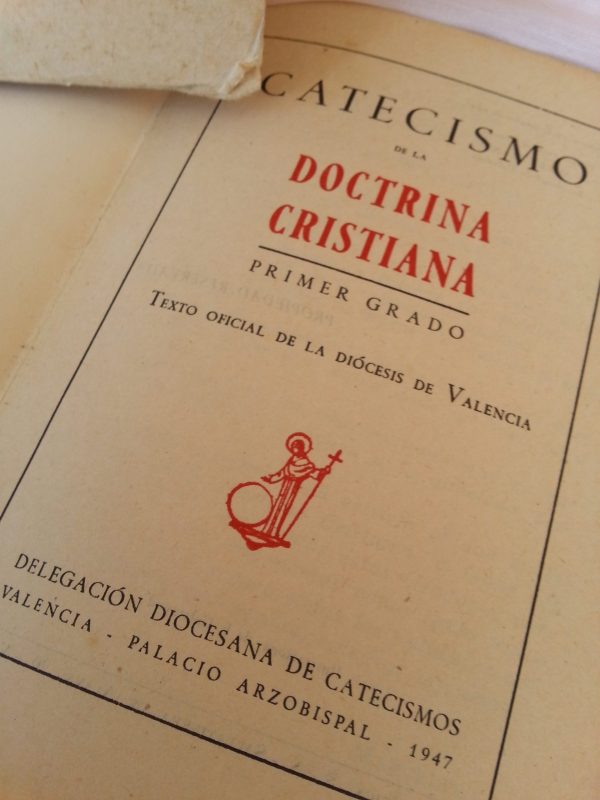 Le acompaña un pequeño Catecismo muy antiguo del año 1.947 que estaba entre las páginas del libro militar.