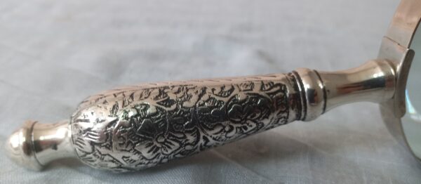 Preciosa  lupa de muy buena calidad, fabricada en metal con mango de metal repujado y grabado con motivos florales.
