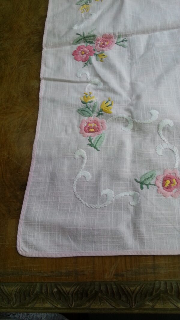 Mantel. Color rosa. 73 cm * 71 cm. Flores bordadas.