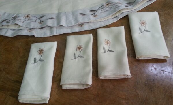 Mantel redondo en algodón. Color beige con flores. Le acompañan 4 servilletas a juego. Buen estado general.