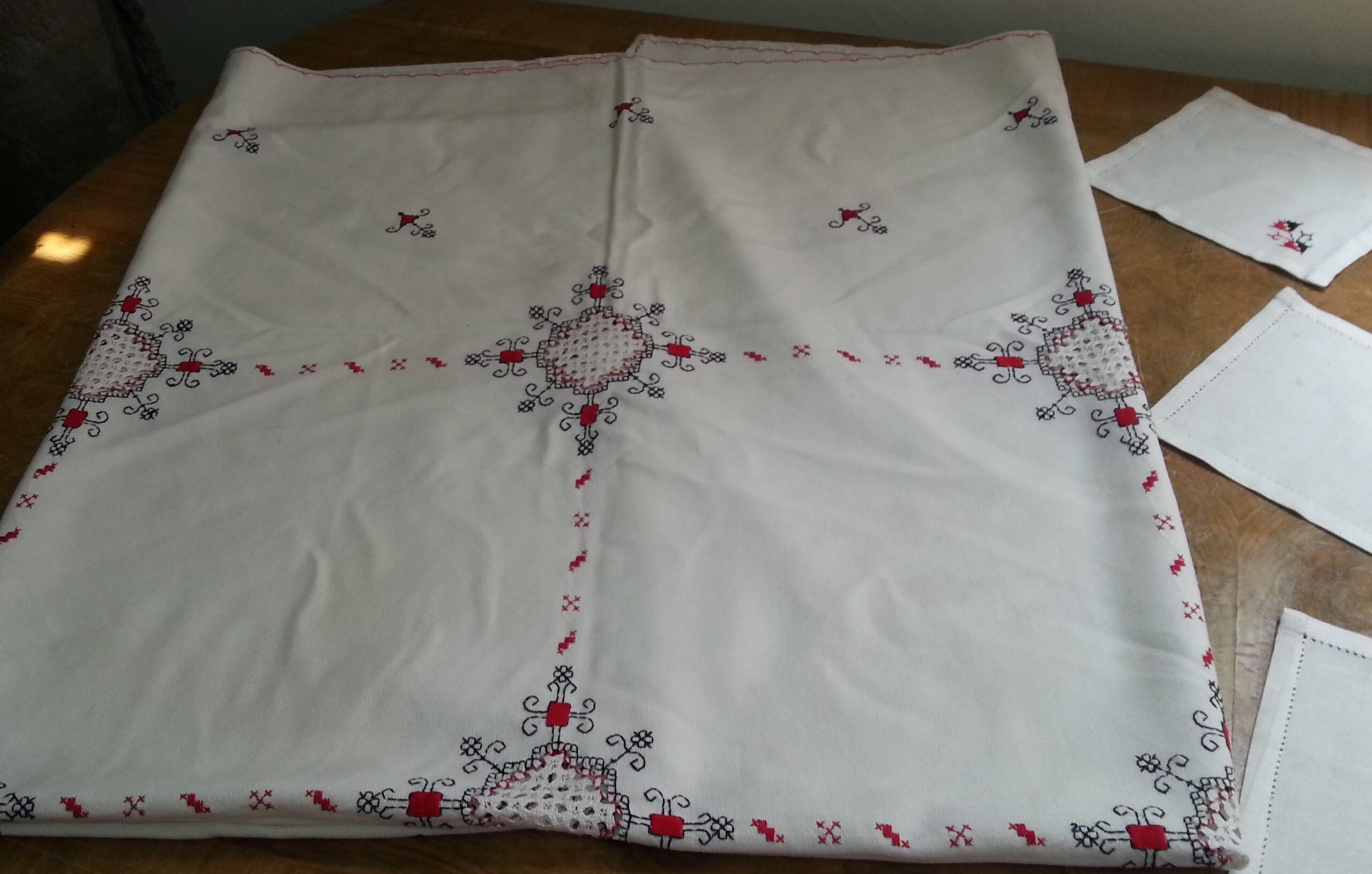Mantel color blanco bordado cn 3 servilletas. Buen estado general.