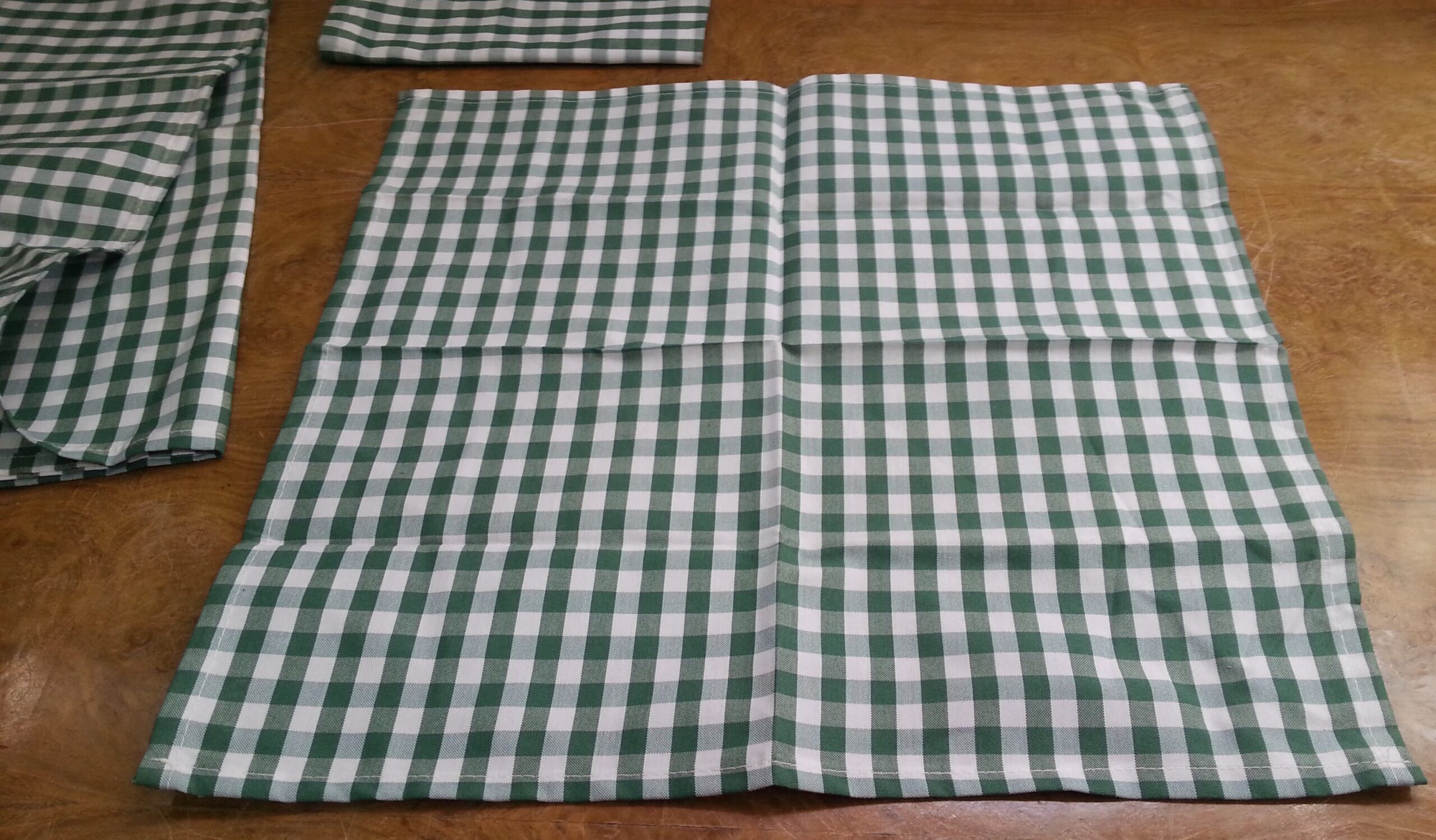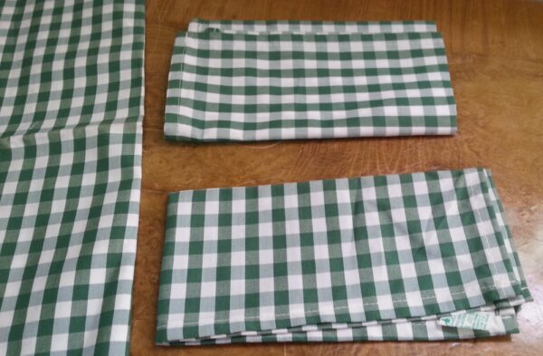 Mantel con cuadros blancos y verdes. Le acompañan 2 servilletas a juego. Buen estado general.