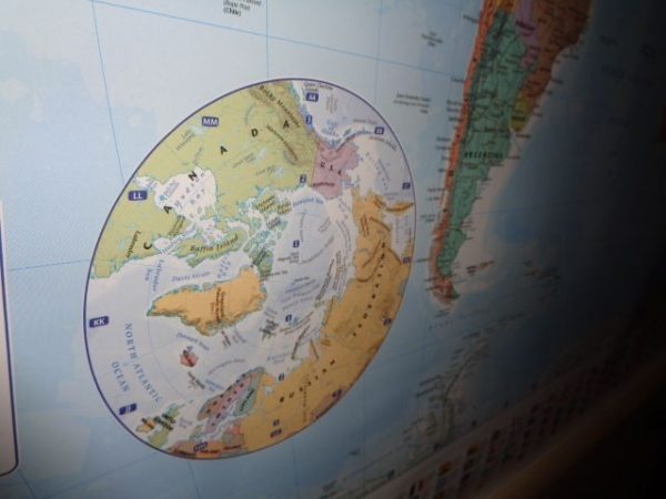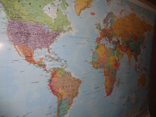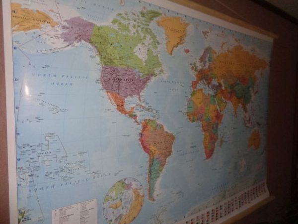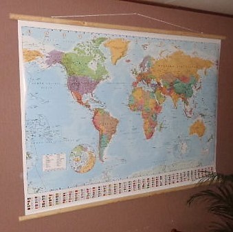 Fabricado en loneta y en perfecto estado. Representa el mapa mundial con todos los países y sus banderas.