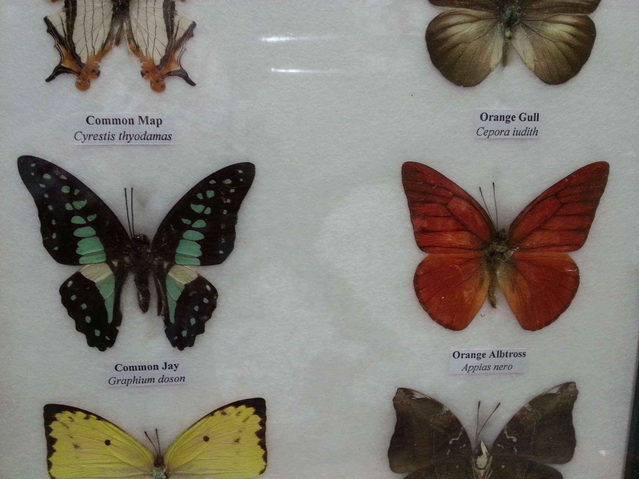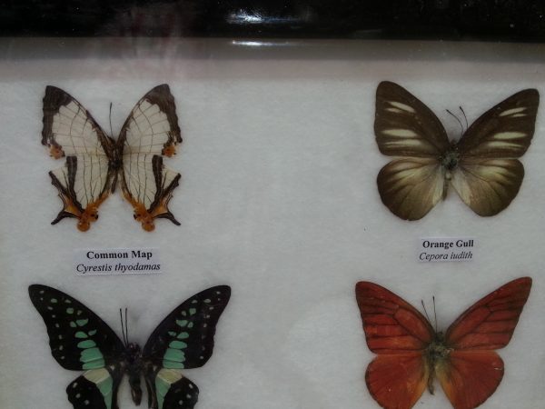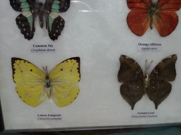 Mariposas disecadas en vitrina. 6 ejemplares diferentes e identificados.