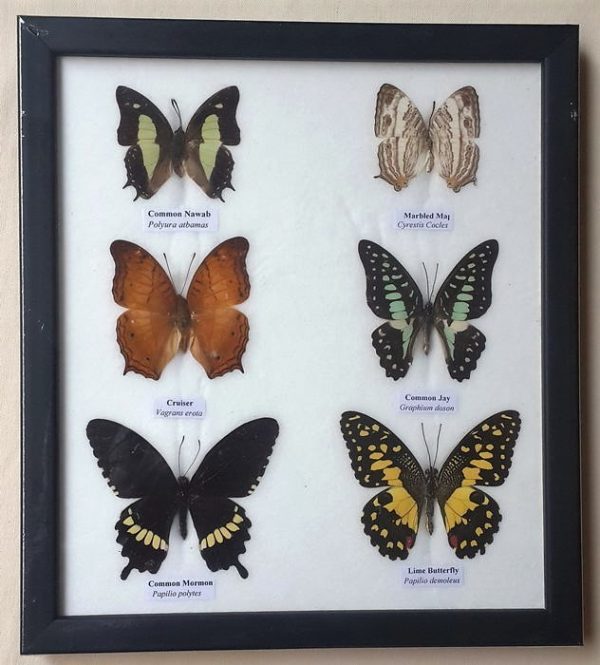 Mariposas disecadas en vitrina. 6 ejemplares diferentes e identificados.