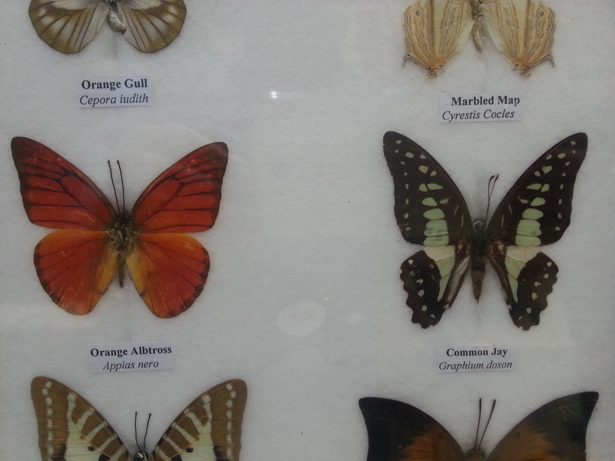 Mariposas disecadas en vitrina. 6 ejemplares diferentes e identificados.