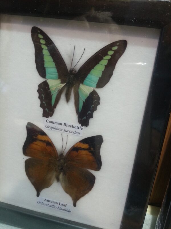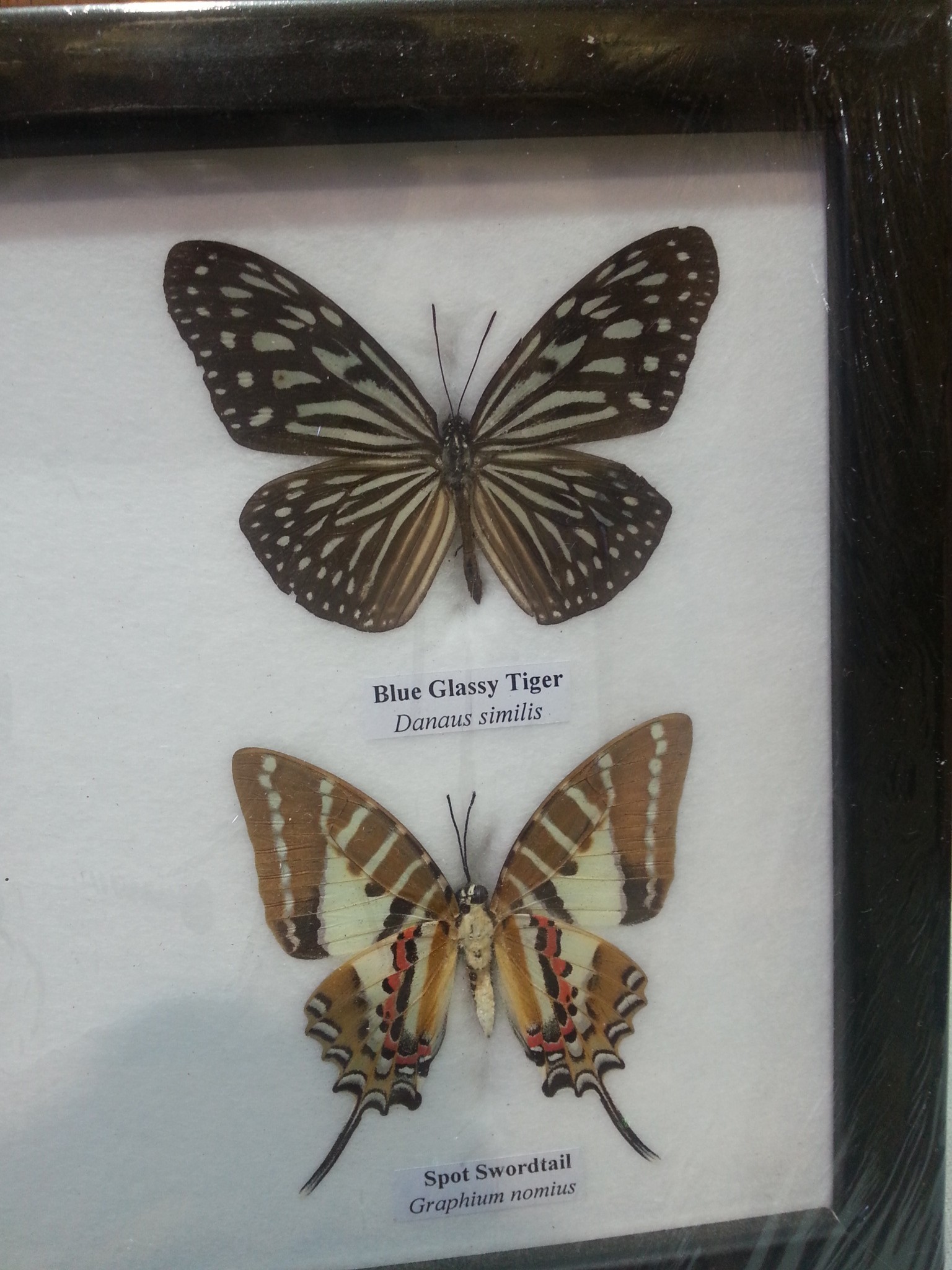 Mariposas disecadas en vitrinas. Dos cuadros acristalados. 6 ejemplares identificados.