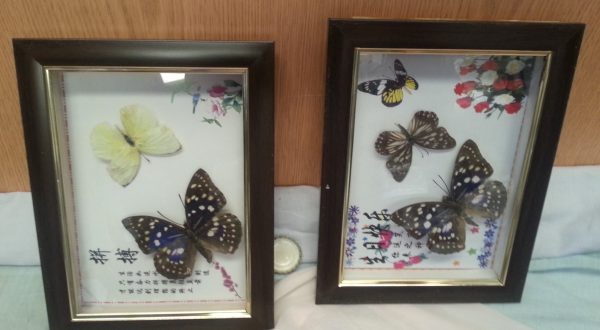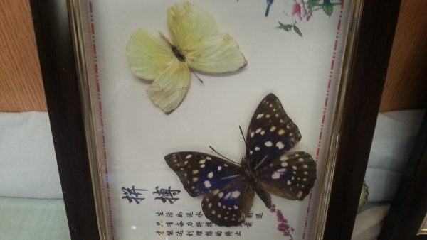 Pareja de marcos acristalados con dos mariposas cada uno. Cada marco tiene su brazo para apoyarse en una mesa.