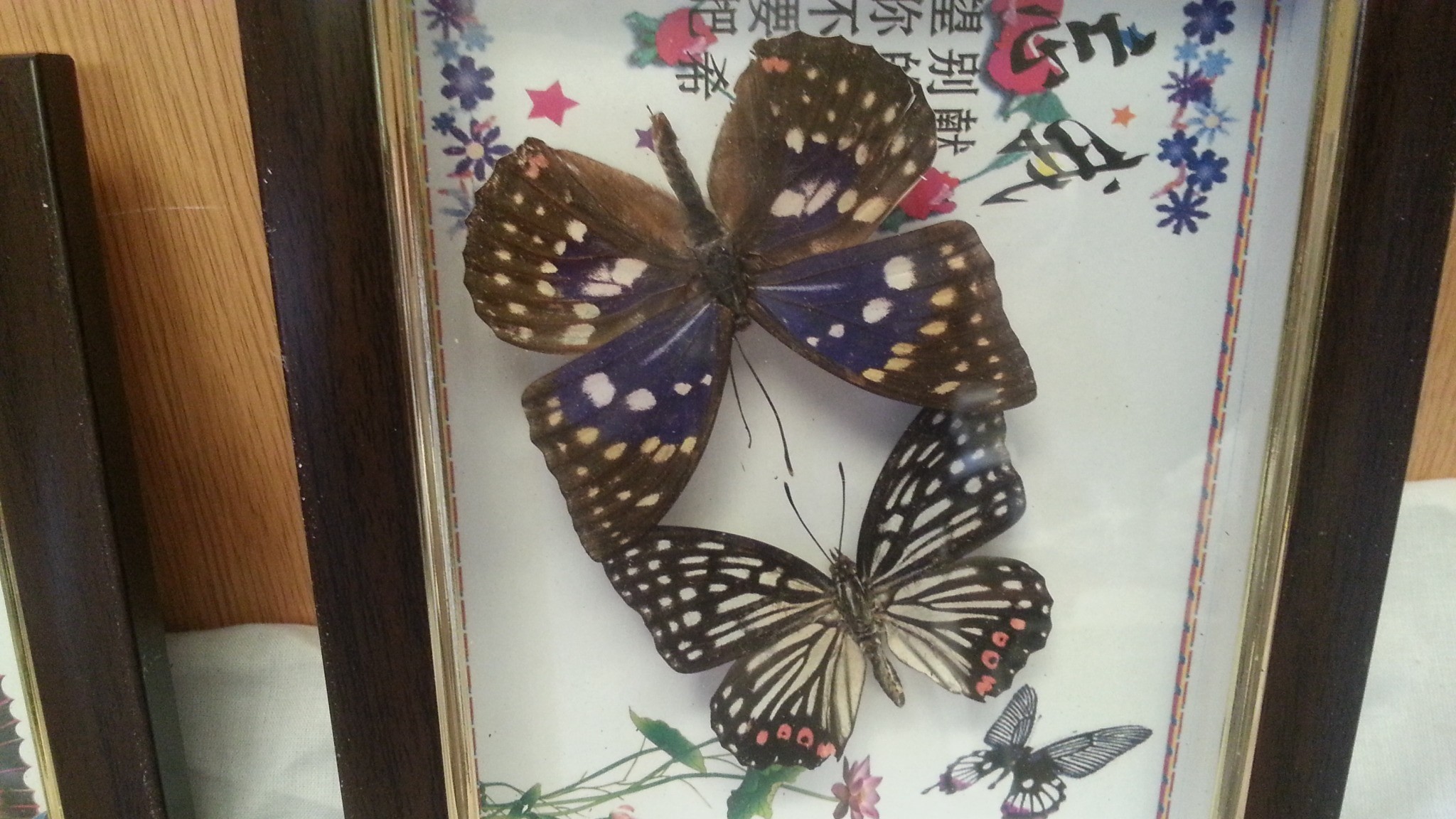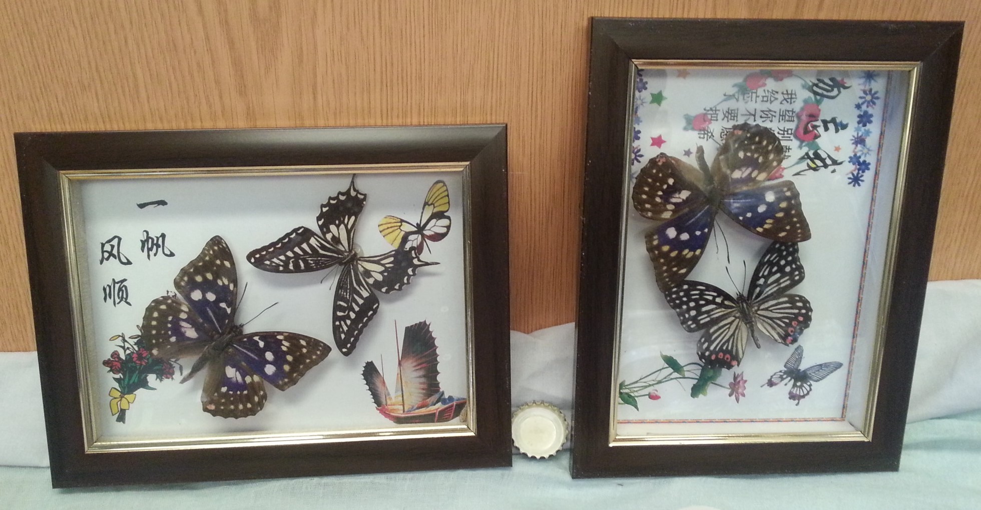 Pareja de marcos acristalados con dos mariposas cada uno. Cada marco tiene su brazo para apoyarse en una mesa.