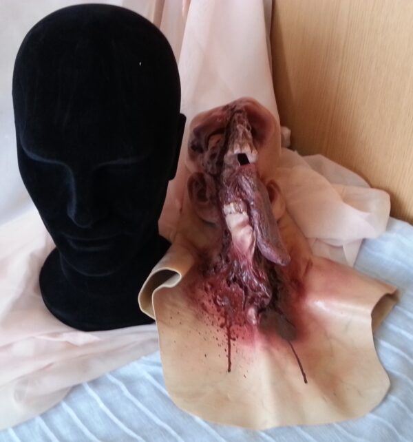 Horripilante máscara completa realizada en látex que incluye busto para su exhibición. Será un magnifico objeto para su gabinete de curiosidades.