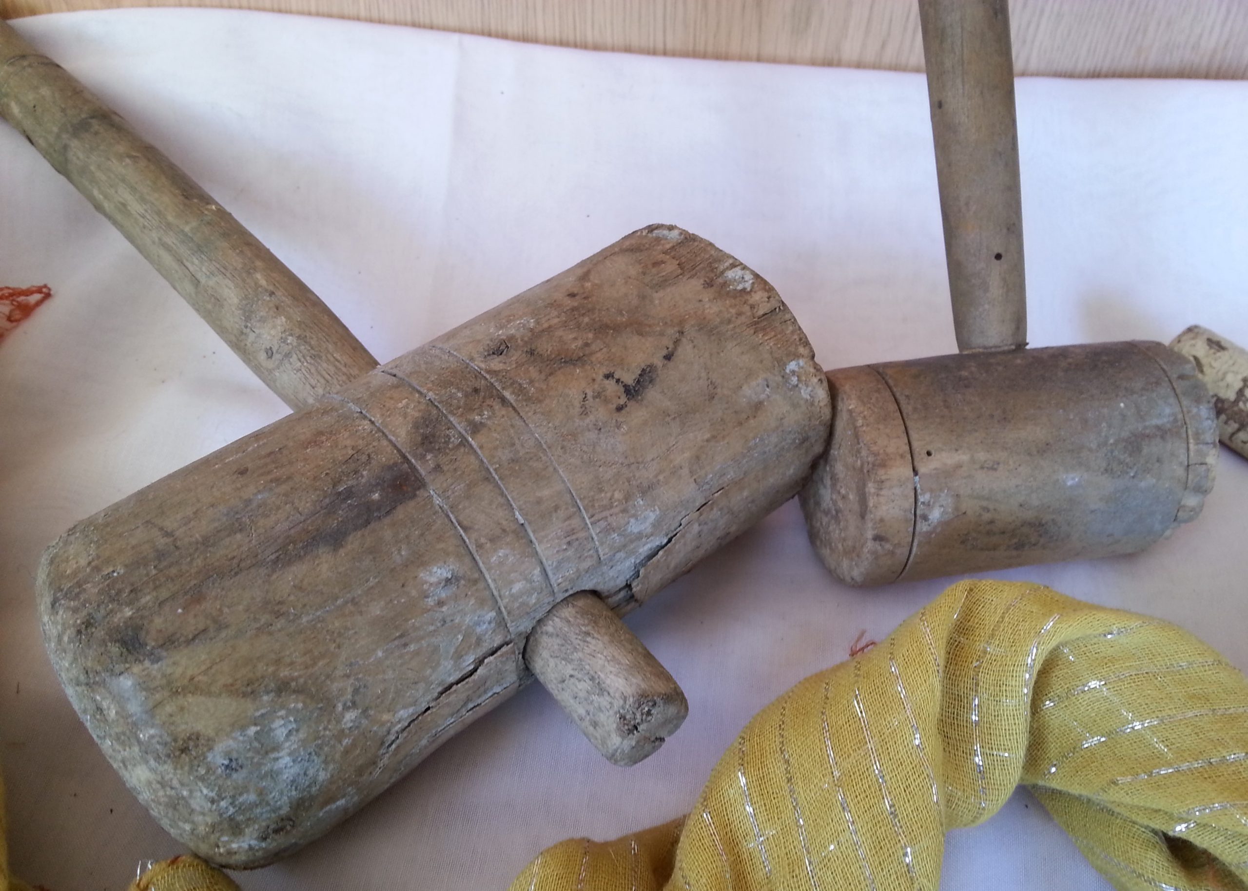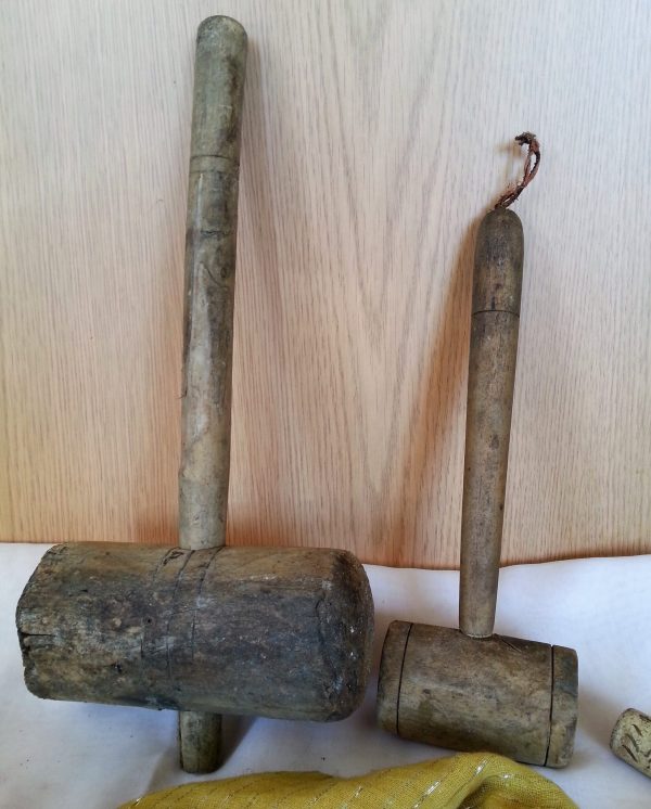 Viejas mazas de madera con los signos y señales del trabajo realizado durante muchísimos años.