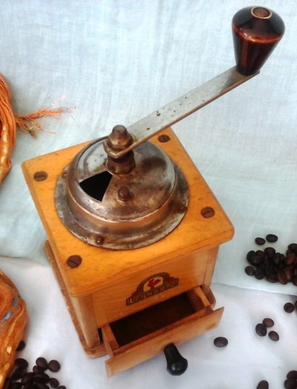MOLINILLO DE CAFÉ MARCA “LEHNARTZ”. VIEJO. MADERA DE HAYA: Signos del tiempo pasado pero muy útil todavía y precioso como objeto de decoración. Conserva en su frente la marca del fabricante. Mide 20cm de alto *17cm de ancho hasta su manubrio. Ref. Molinillo nº 93