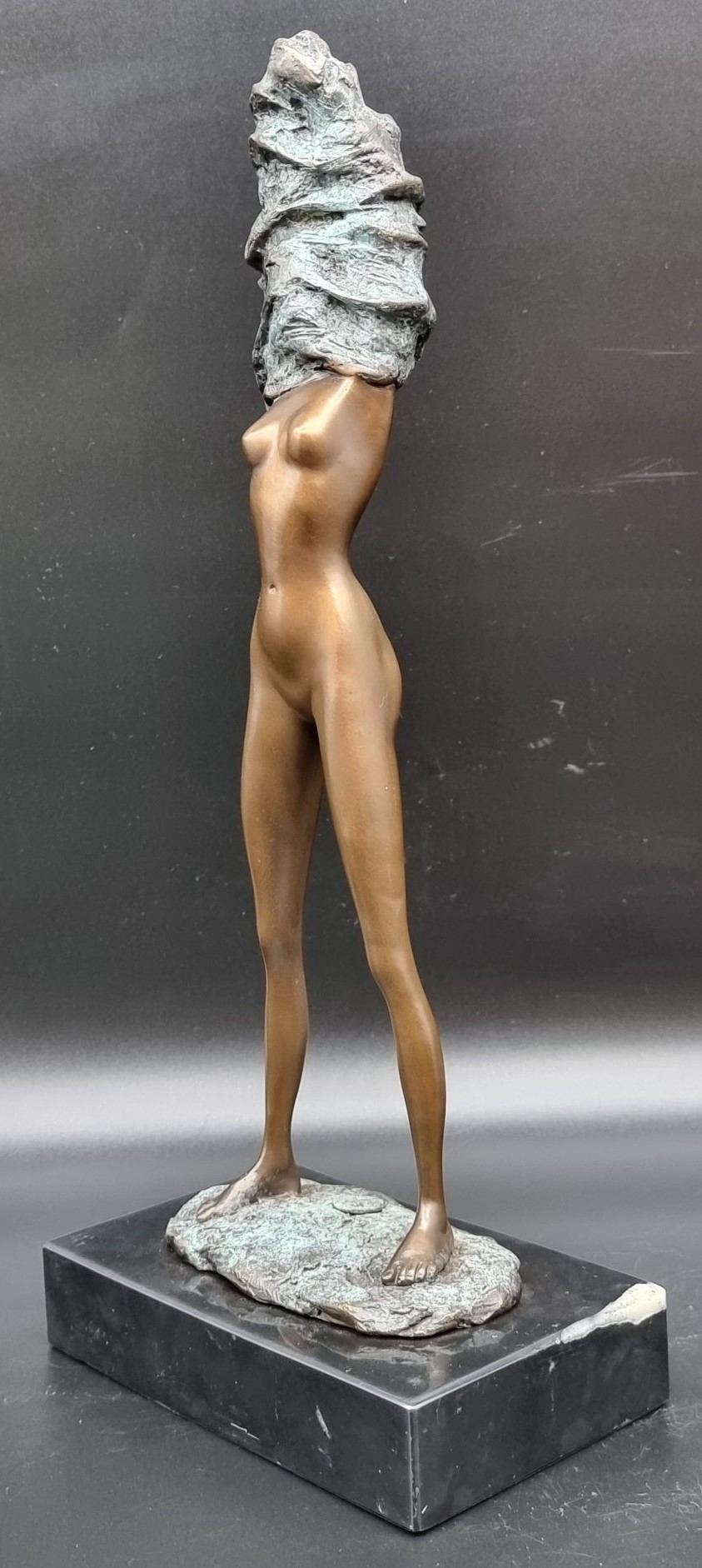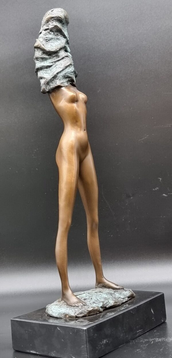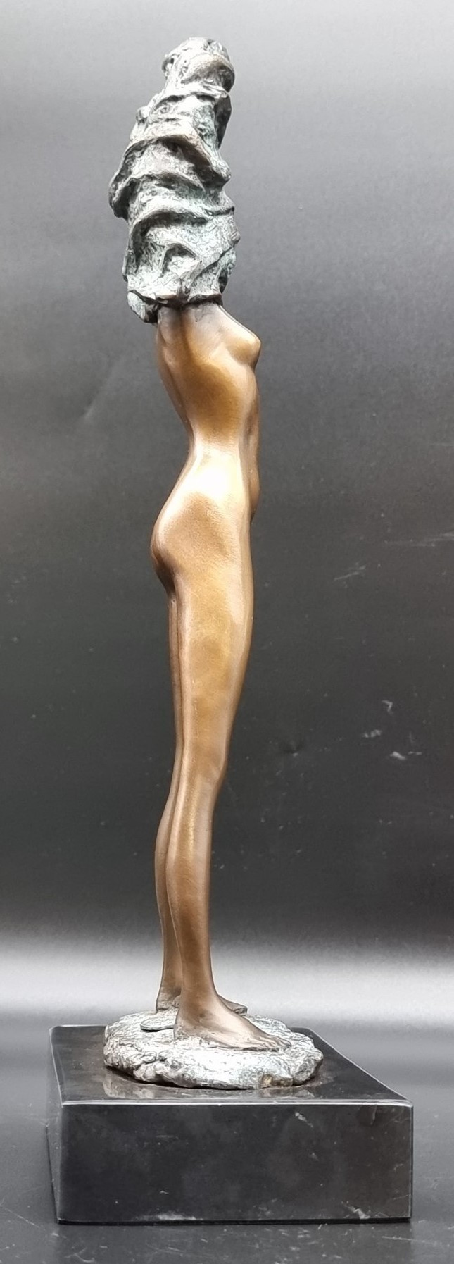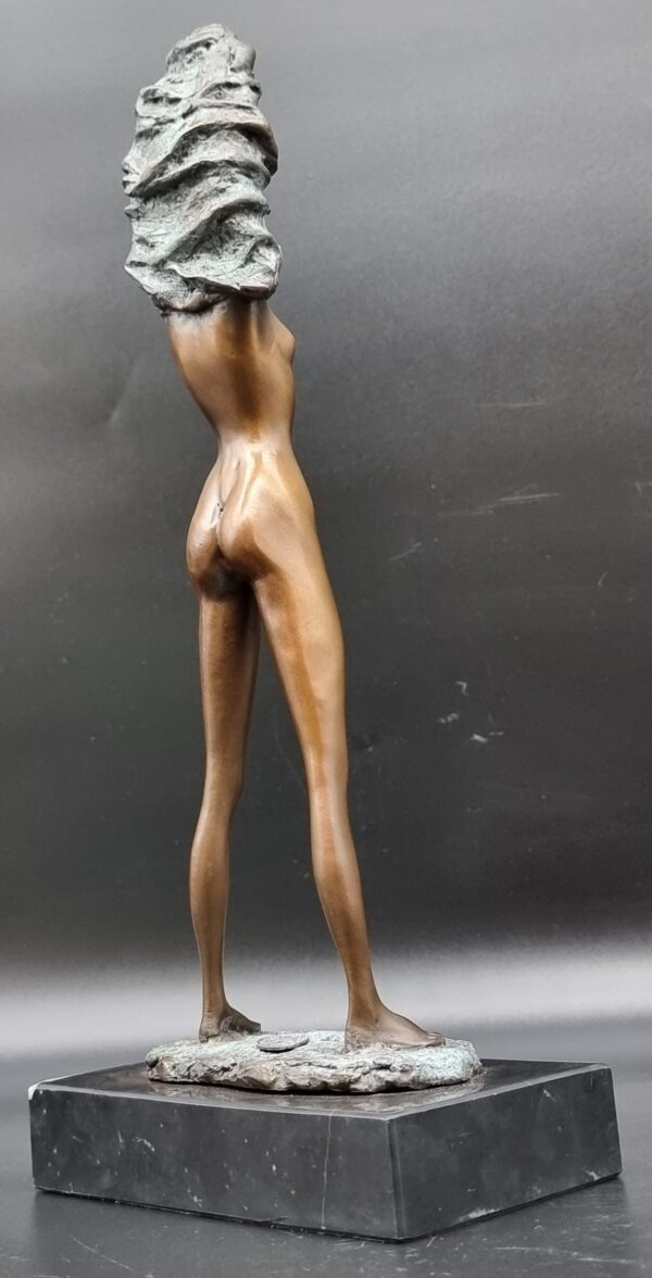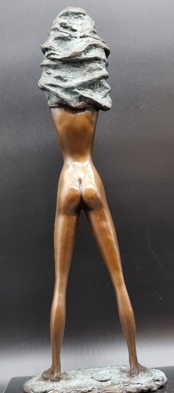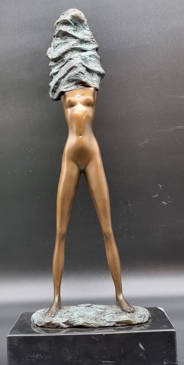 Preciosa escultura en bronce con pedestal de mármol de una dama desnudándose. Arte realista.