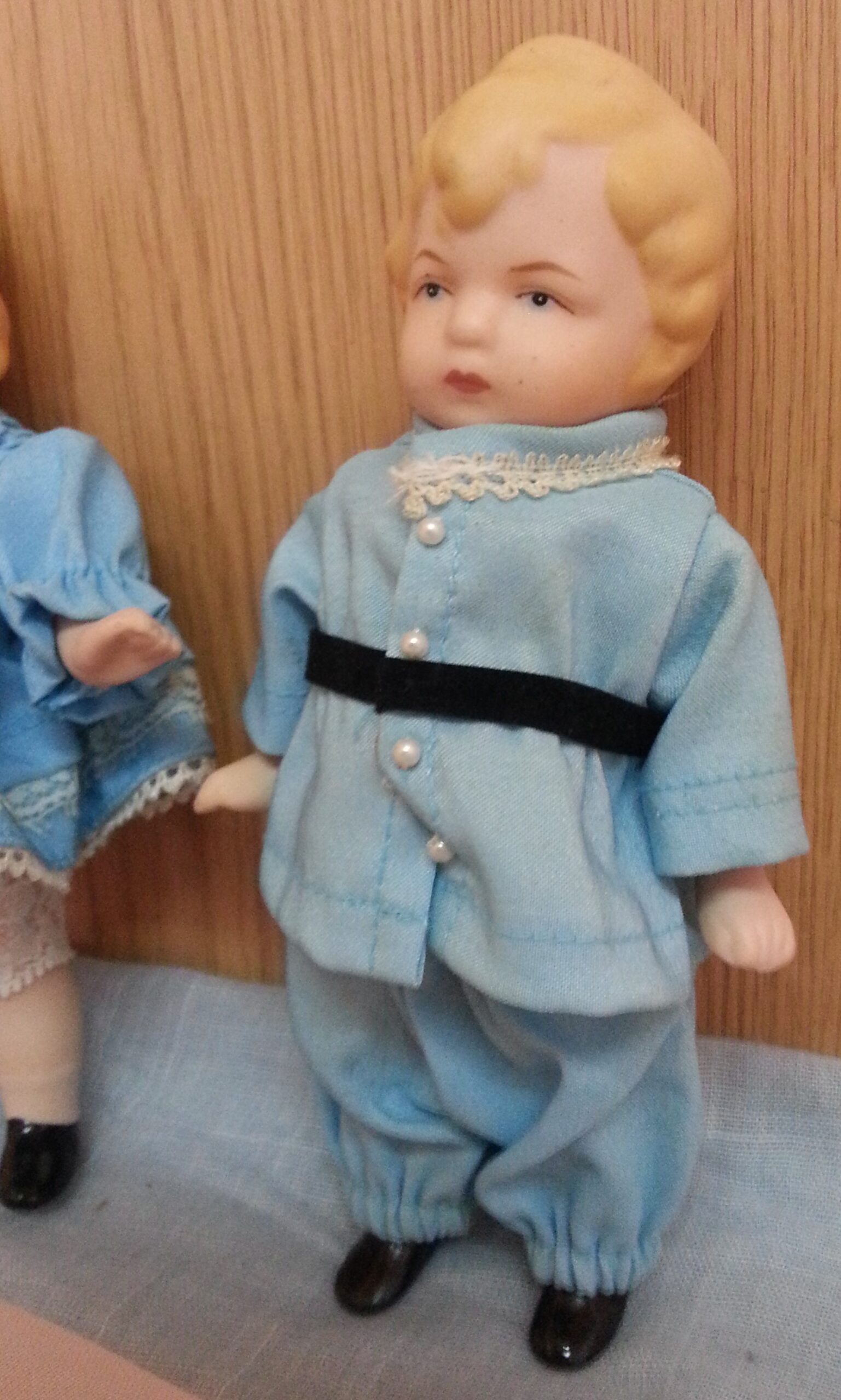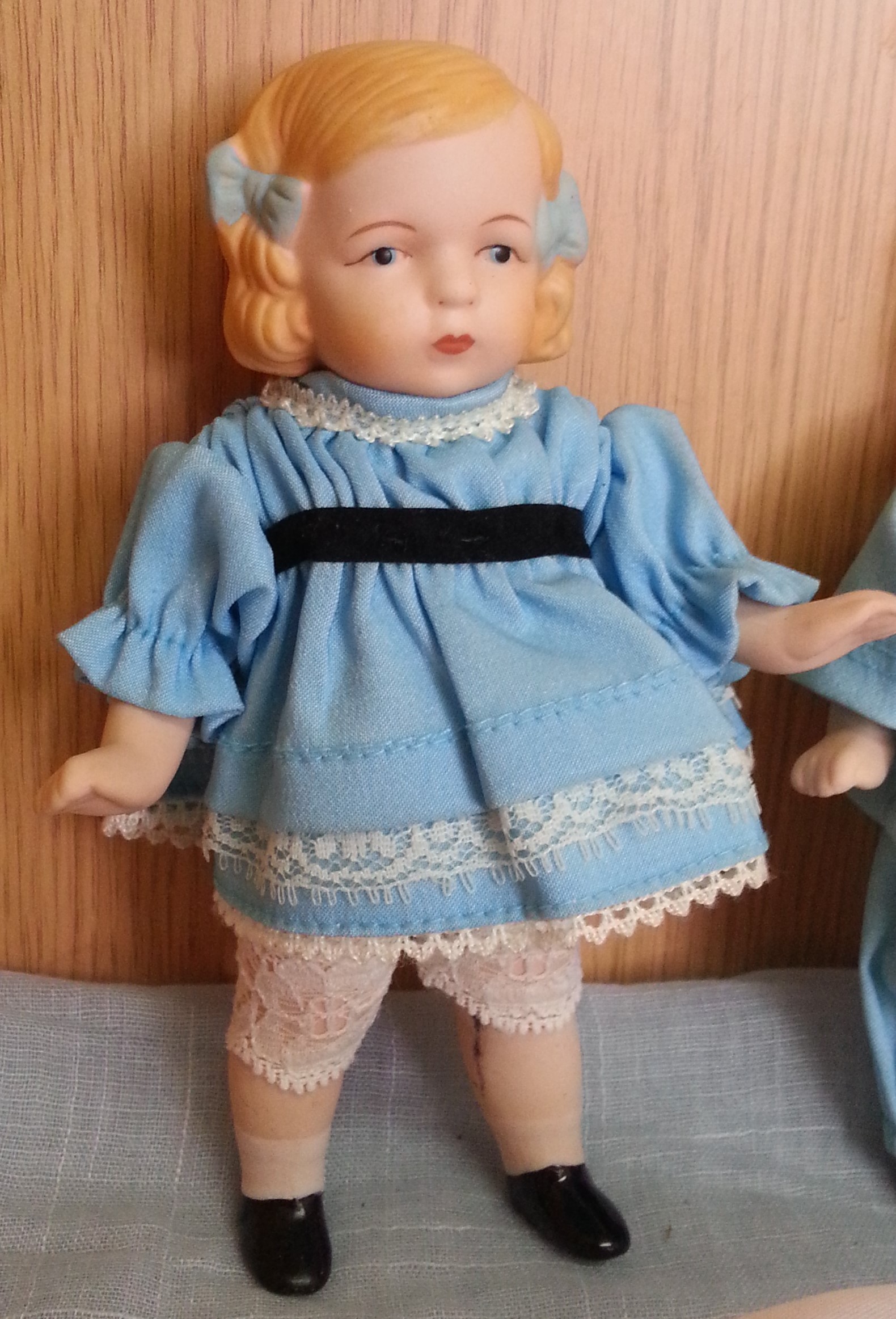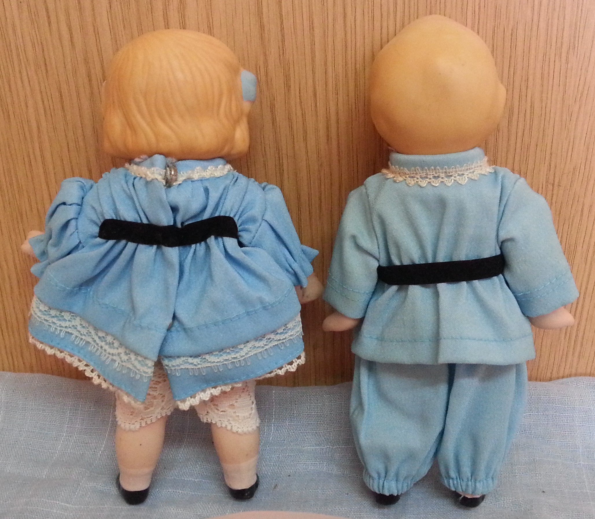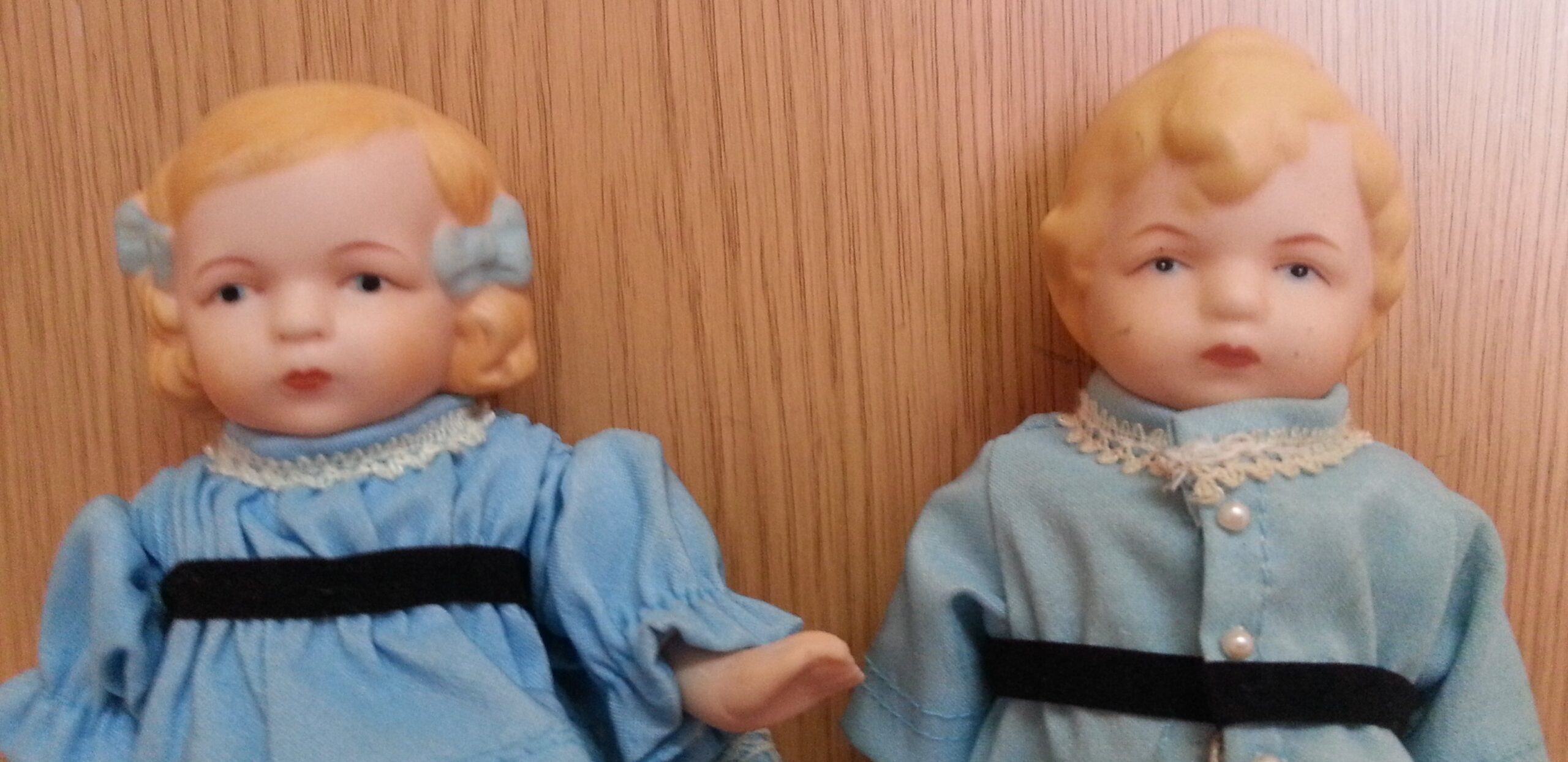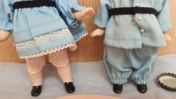 Pareja de muñequitas con cuerpo y carita de porcelana para coleccionar o para alquilar en sus decorados como atrezzo.
