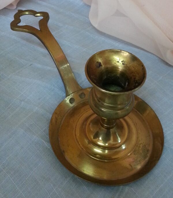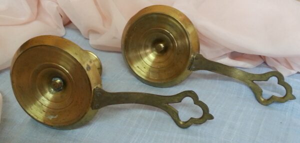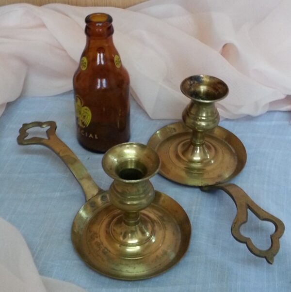 Se notan los años pasados por esta emblemática pareja de palmatorias pero seguirán siendo útiles muchísimos años más. Fabricadas totalmente en bronce.