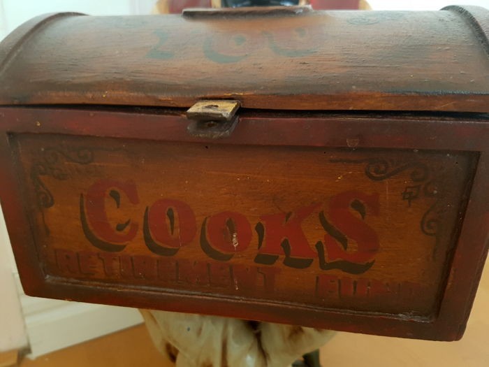 Original figura de panadero con mirada cariñosa que estando sentado en su taburete, ofrece galletas de su caja pastelera.