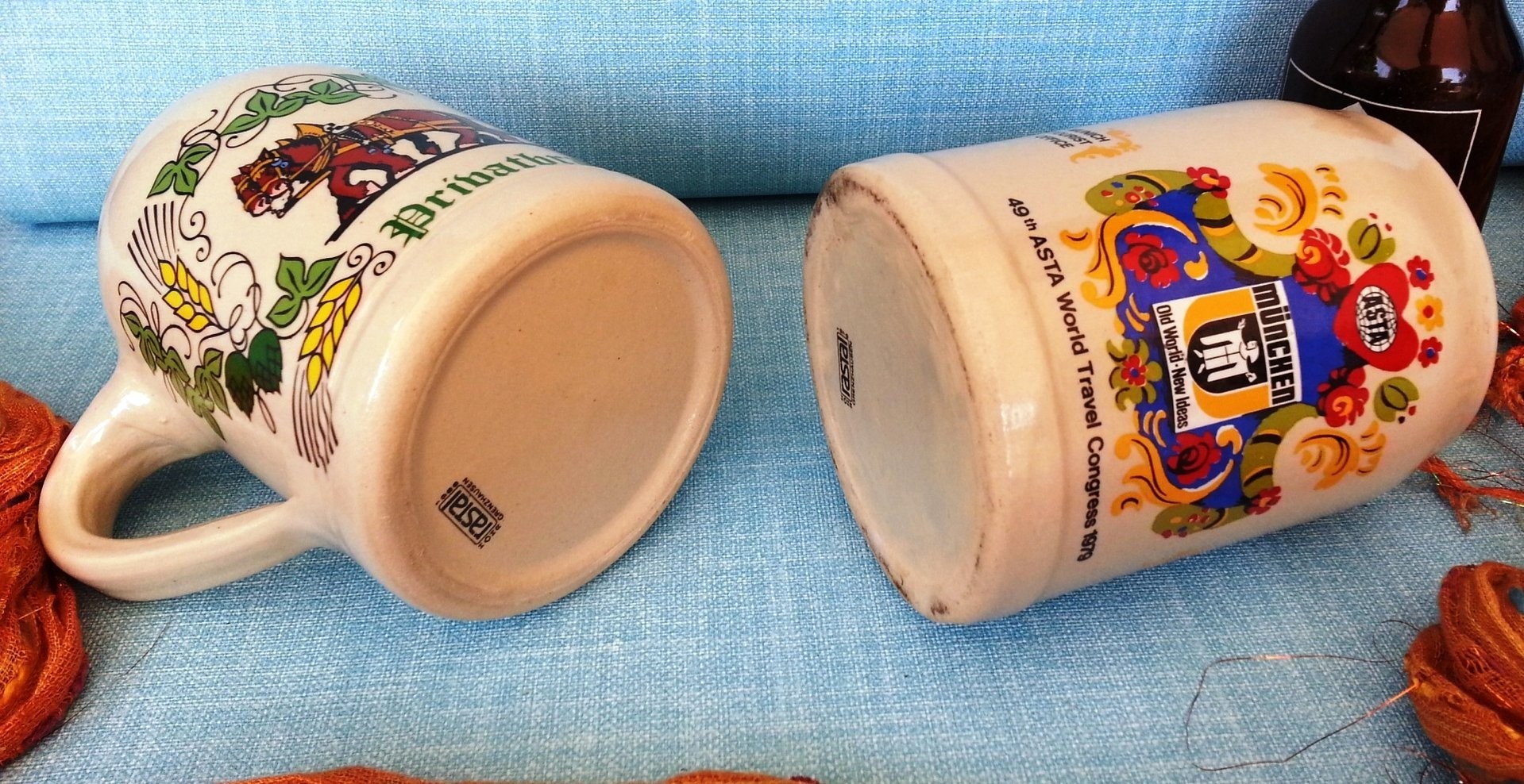 PAREJA DE JARRAS CERVECERAS (ALEMANAS): Muy buen estado. Origen alemán. Mide cada una 12,5 cm de alto * 15 cm de ancho hasta su asidera. Ref. Jarras nº 123
