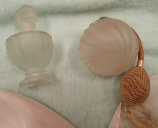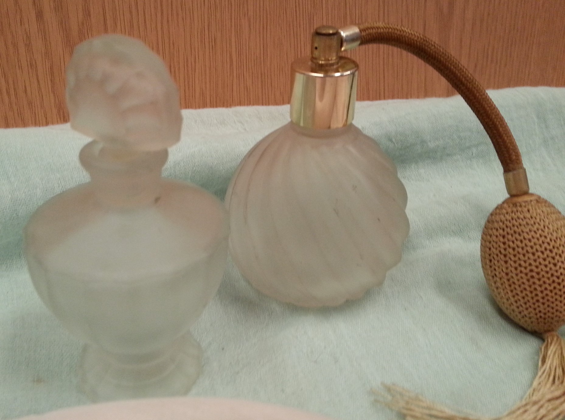 Precioso conjunto de perfumero y tarro en vidrio. Vintage.
