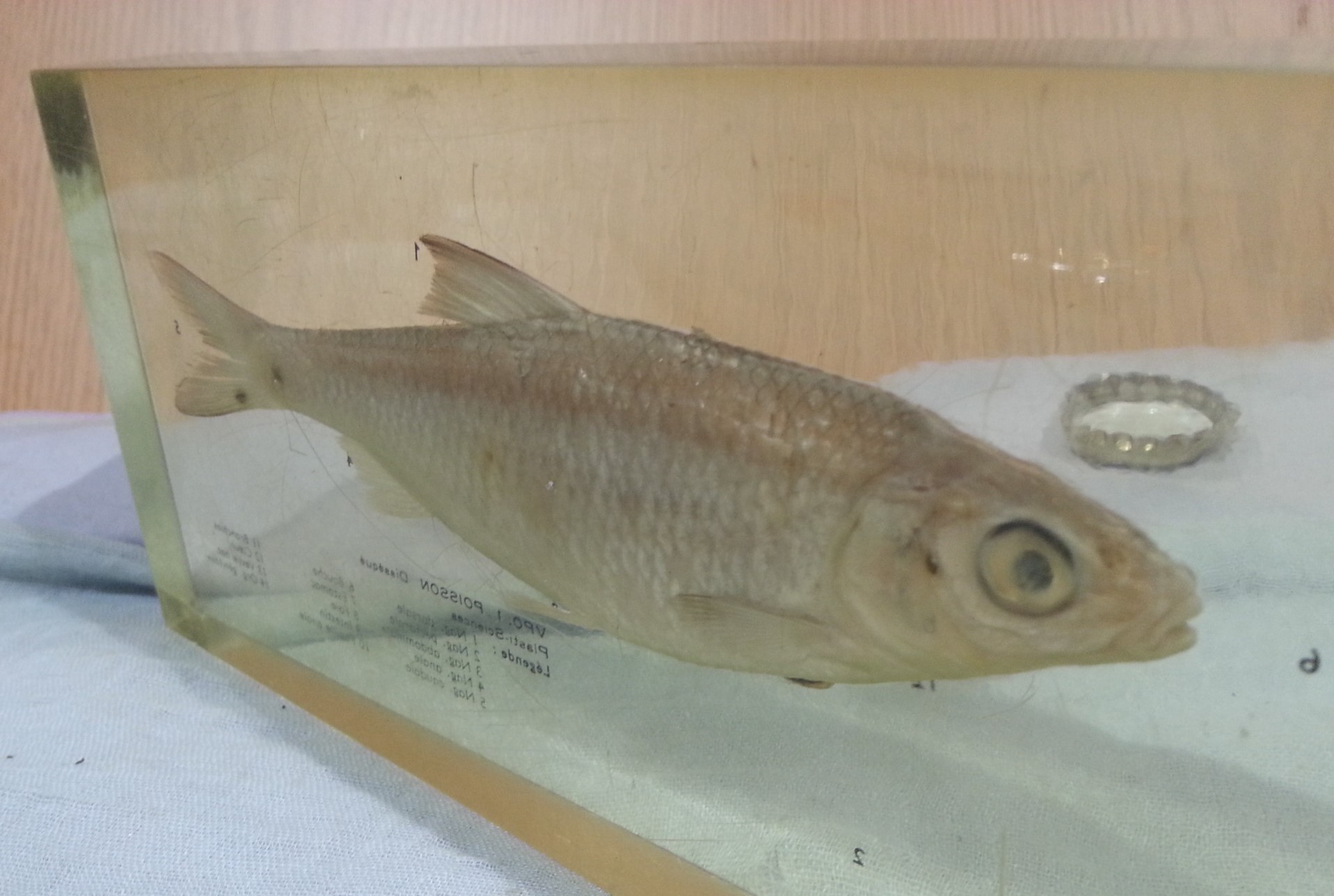 Procedente de un colegio francés. Los diferentes órganos de este pez fueron separados y numerados para facilitar su observación y aprender.