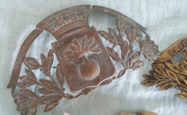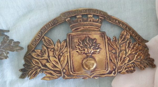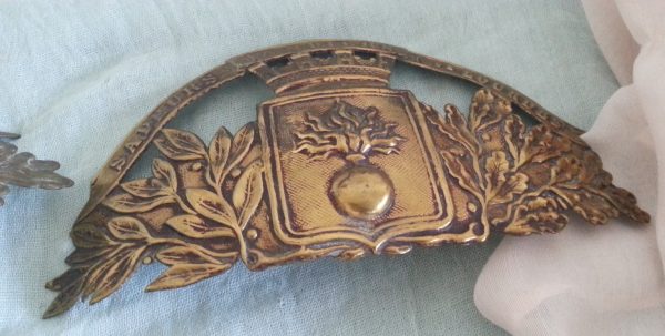 Placas antiguas de cascos de bomberos. En cobre. Pareja.