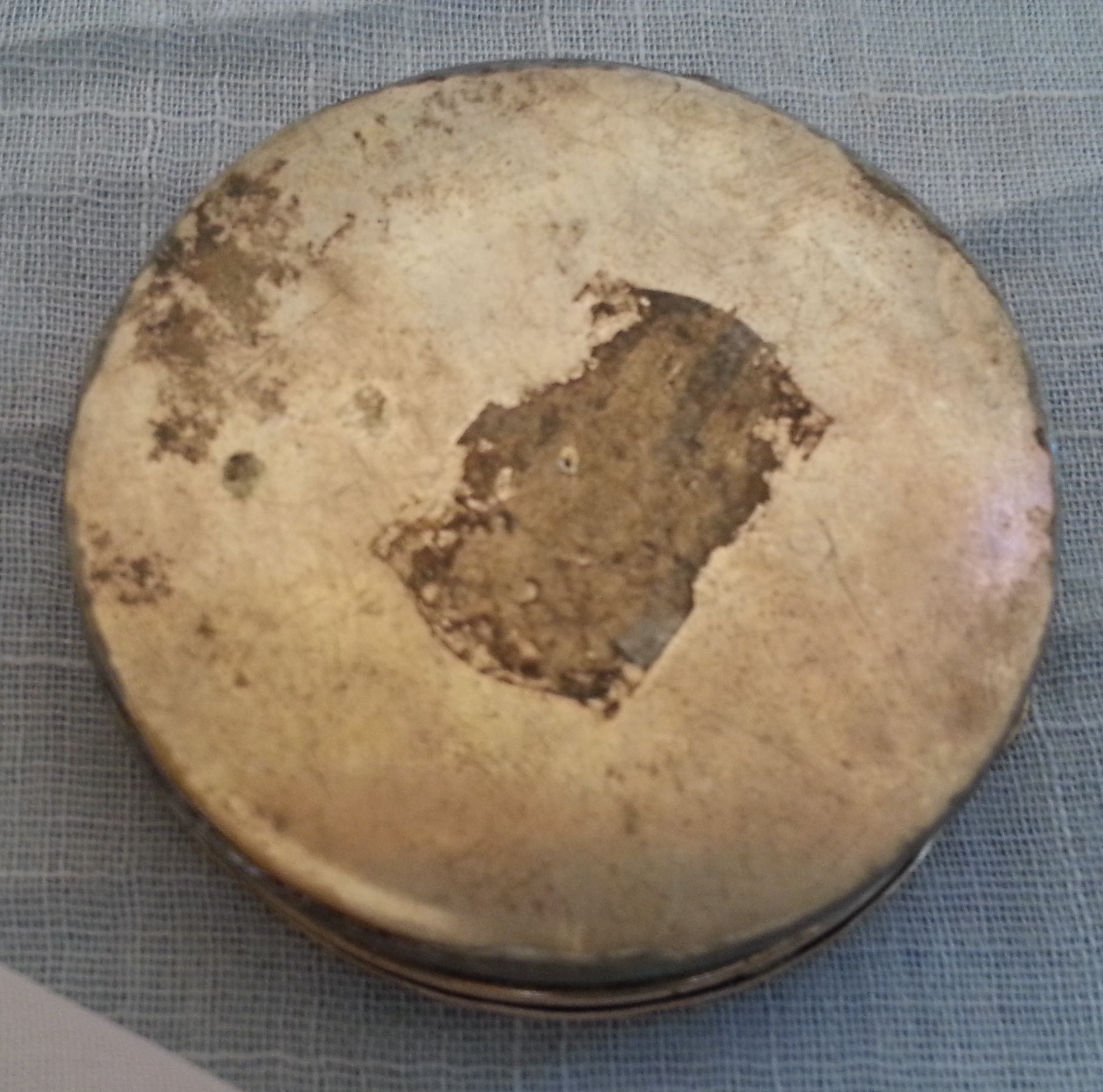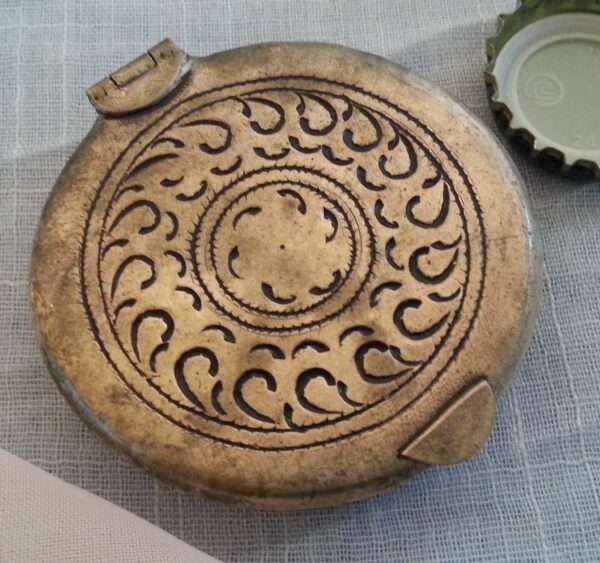 Preciosa polvera con grabados en su tapa.