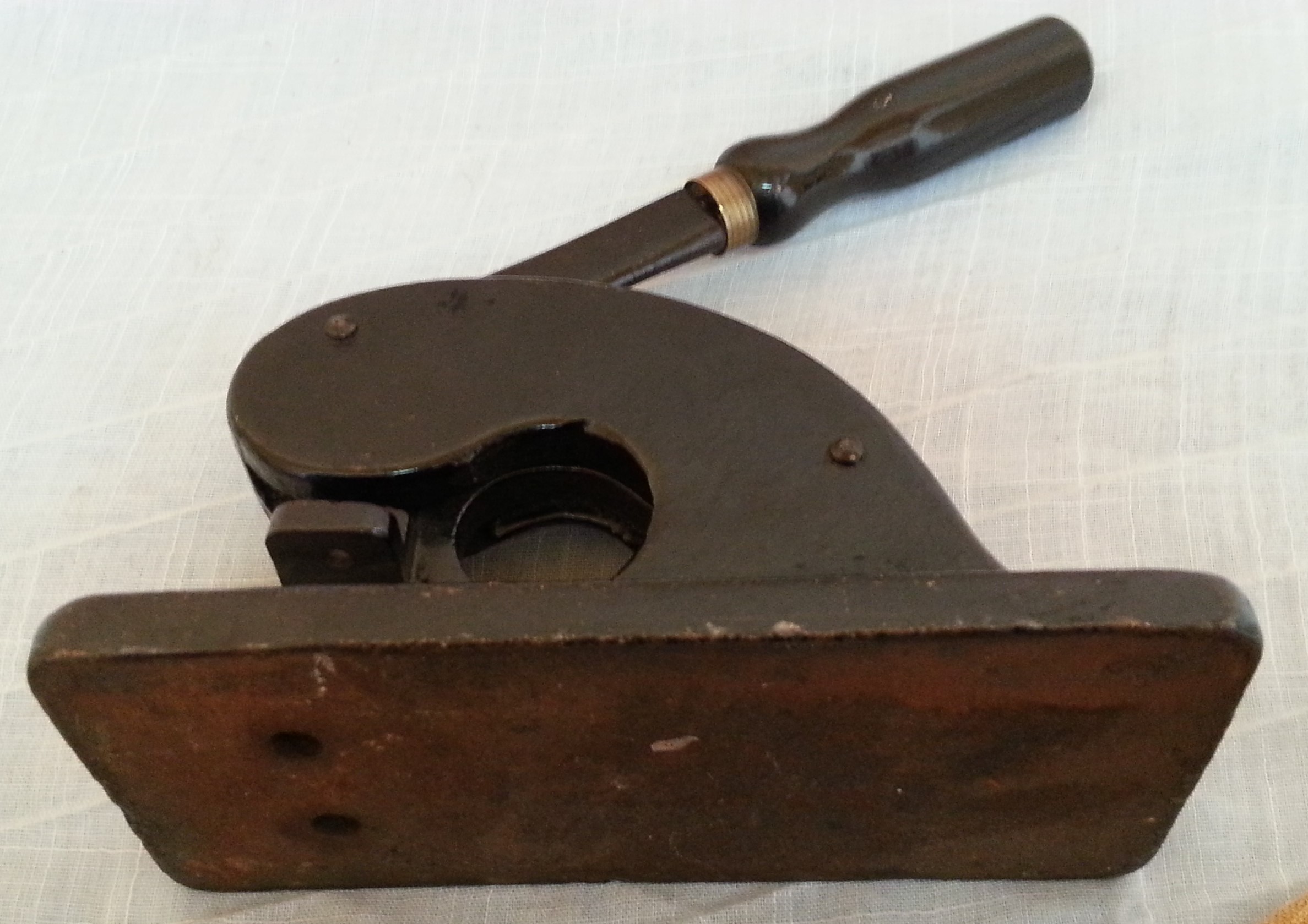 Antigua prensa de sello en seco con relieve. Fabricada en hierro macizo con mango de madera en los años 30-50.