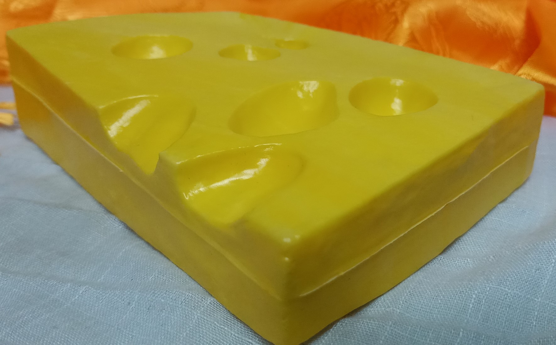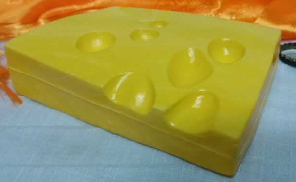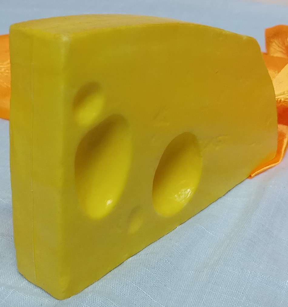 Se trata de una porción de queso ficticio para decoración o atrezzo.