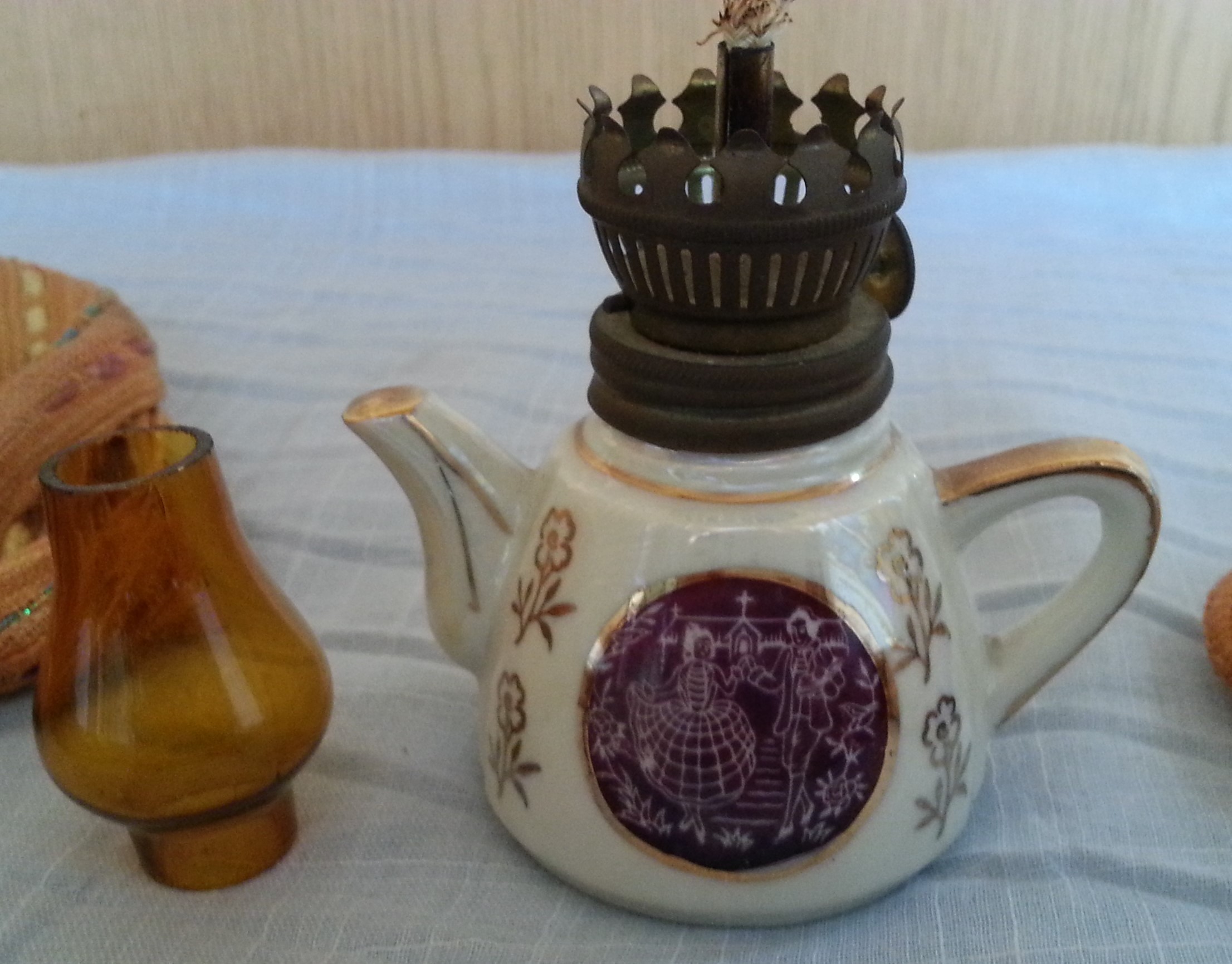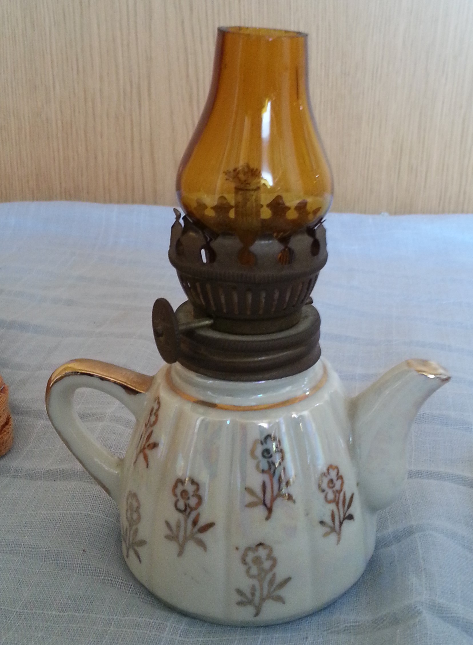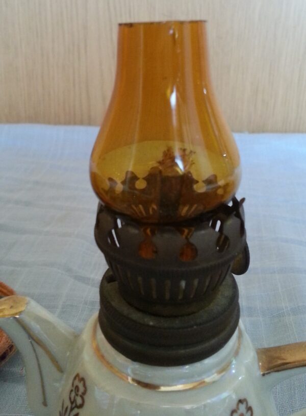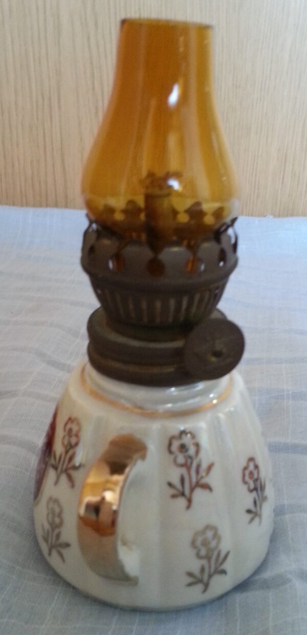 Precioso quinqué de colección en cerámica y vidrio. Pequeño tamaño.