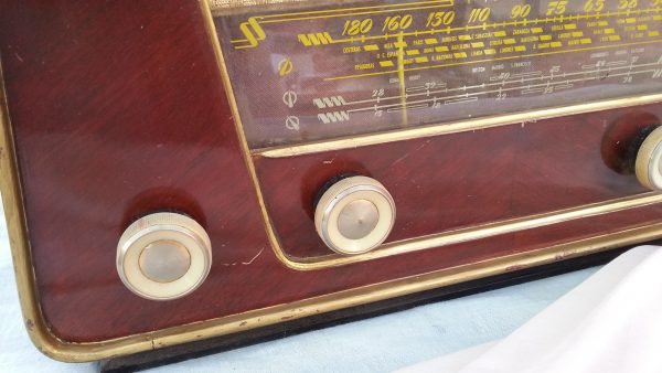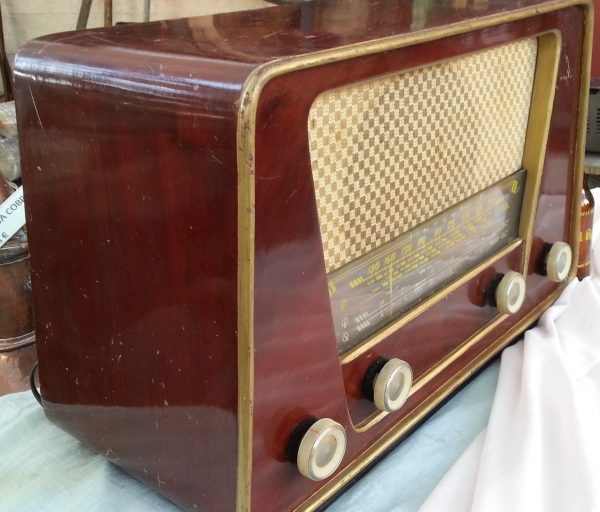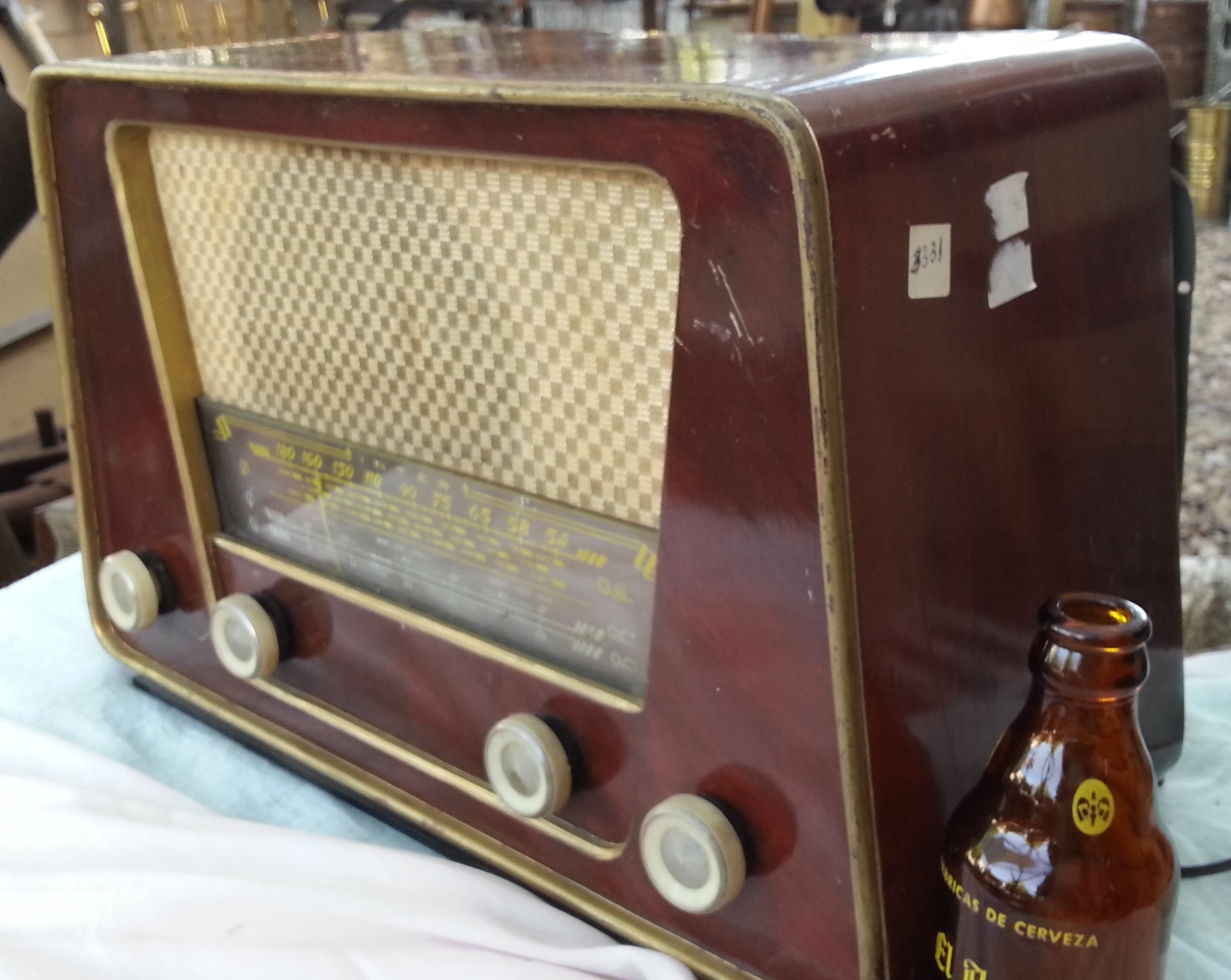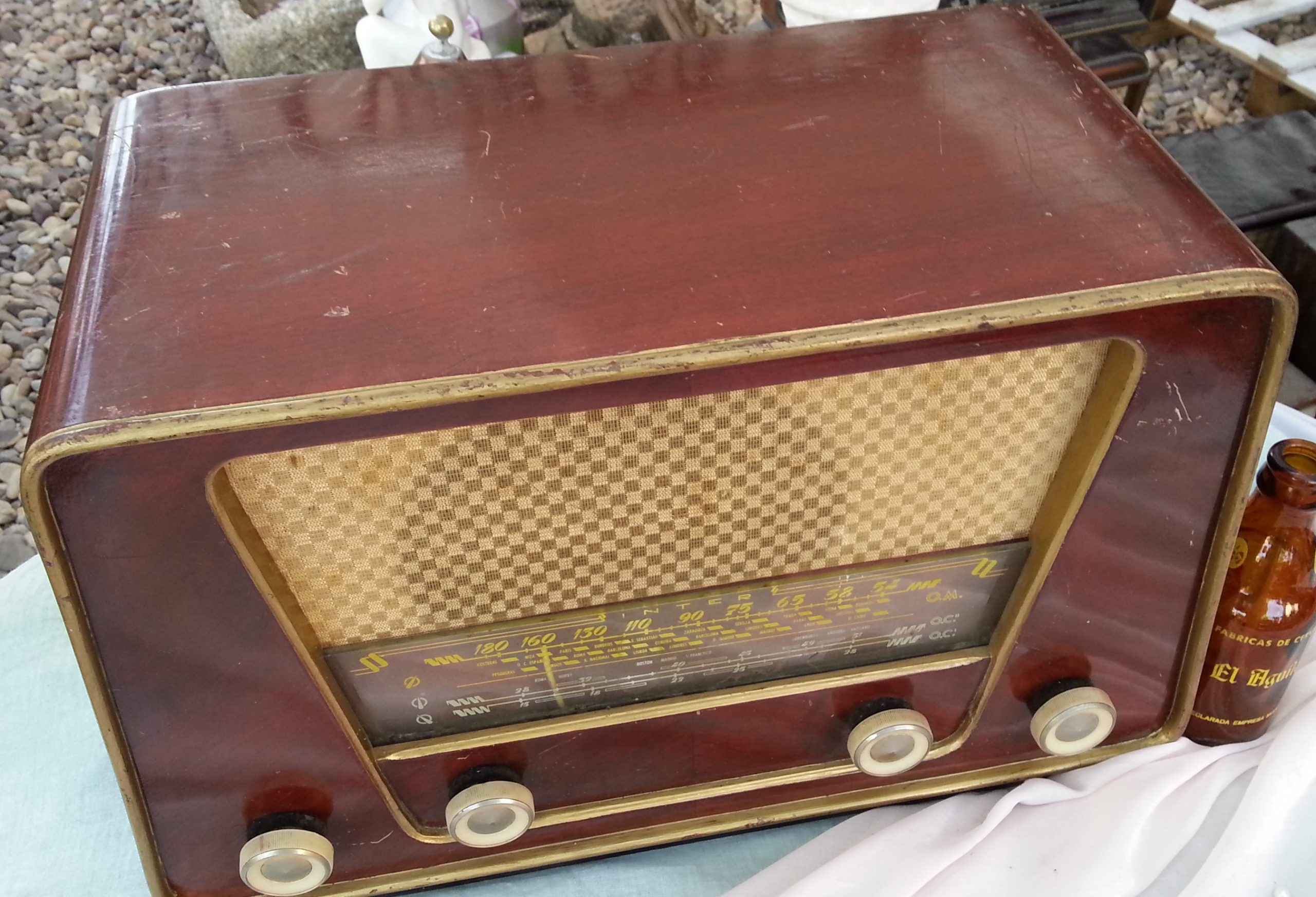 Preciosa radio de válvulas antigua. Desconocemos si sigue funcionando. Es un fantástico objeto antiguo para entretenerse en restaurar o para dejarlo tal cual se encuentra, ya que decorará cualquier espacio de su hogar o escaparate.
